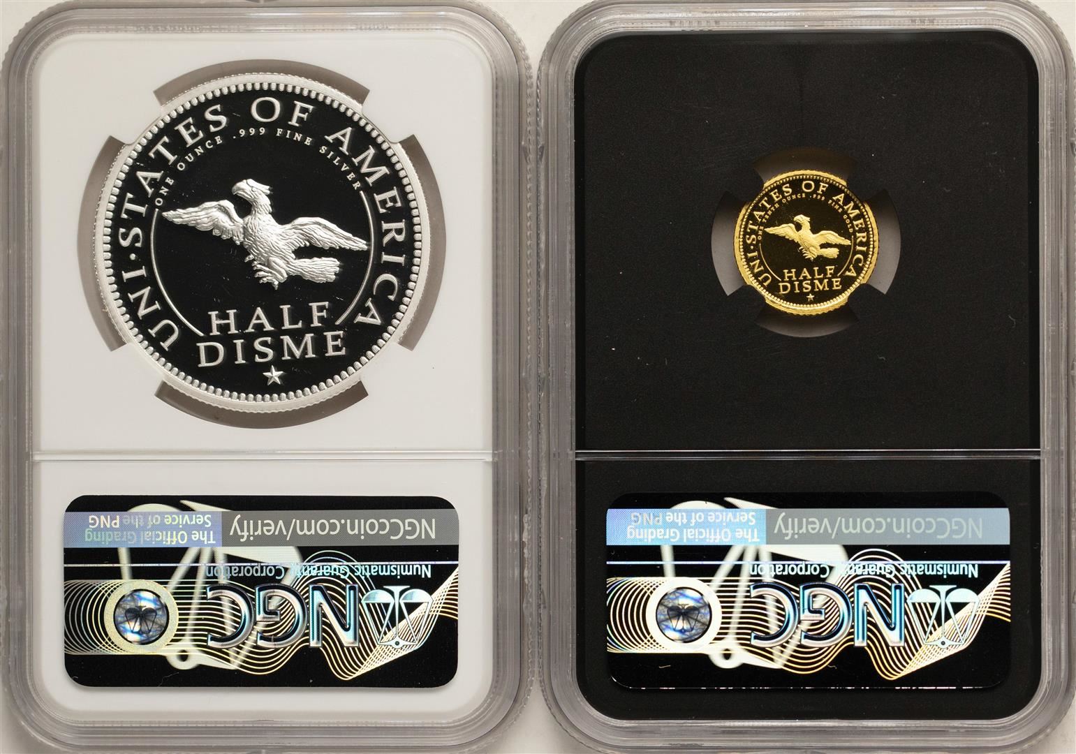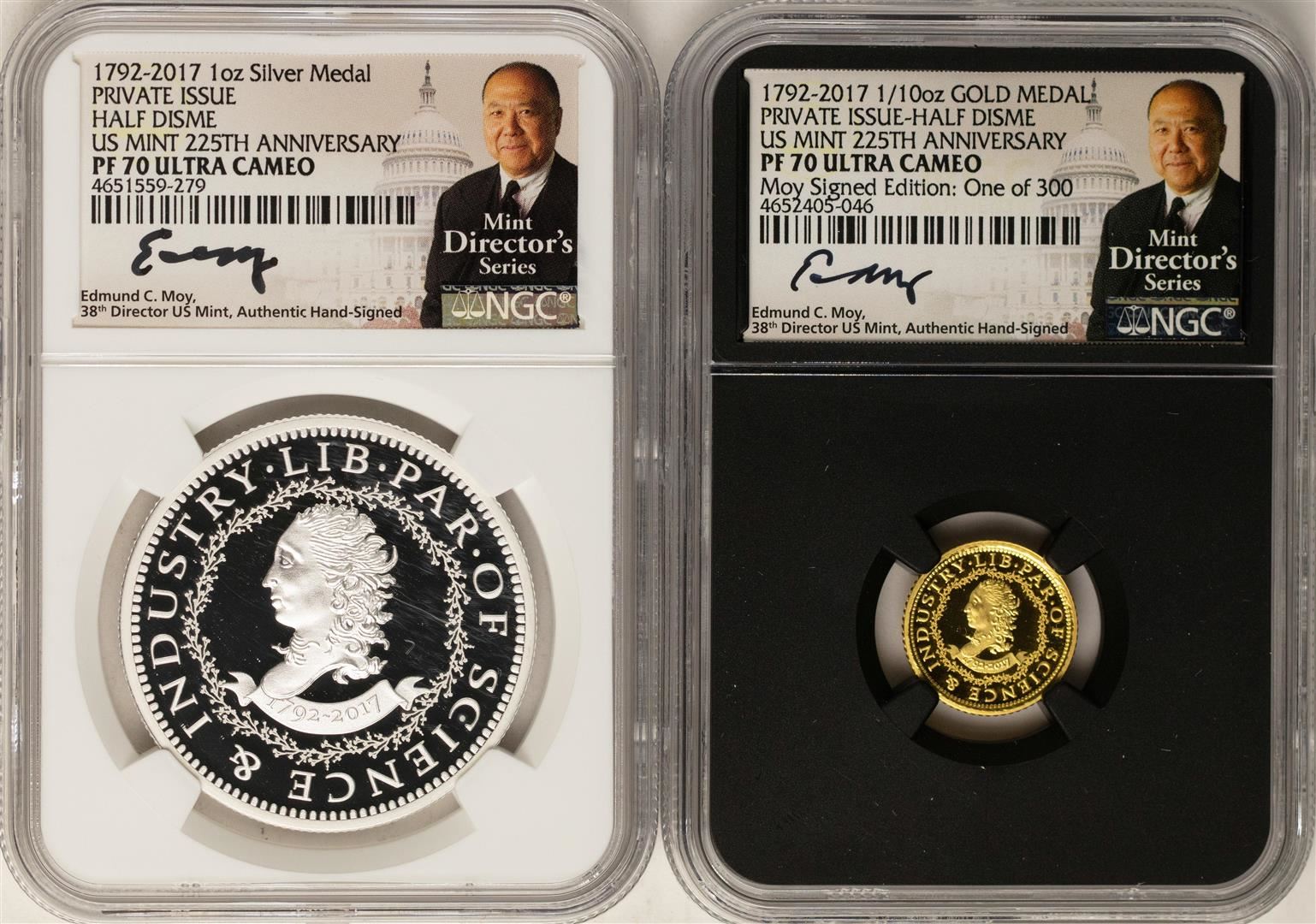 One 1792-2017 Half Disme 1/10 oz. Gold & 1oz. Silver Medals NGC PF70 W/ Moy Signature Set. NGC Certified.