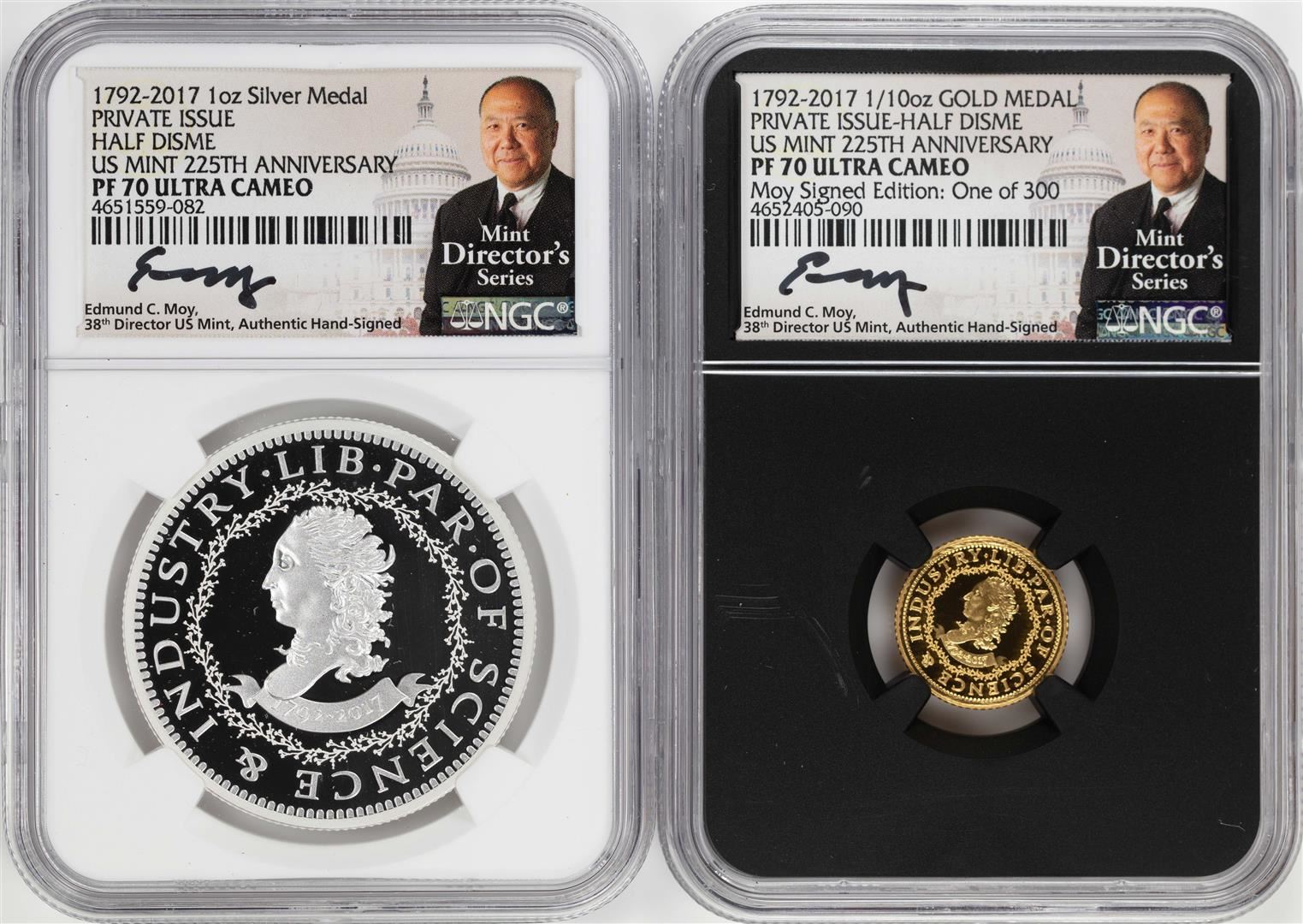 One 1792-2017 Half Disme 1/10 oz. Gold & 1oz. Silver Medals NGC PF70 W/ Moy Signature Set. NGC Certified.