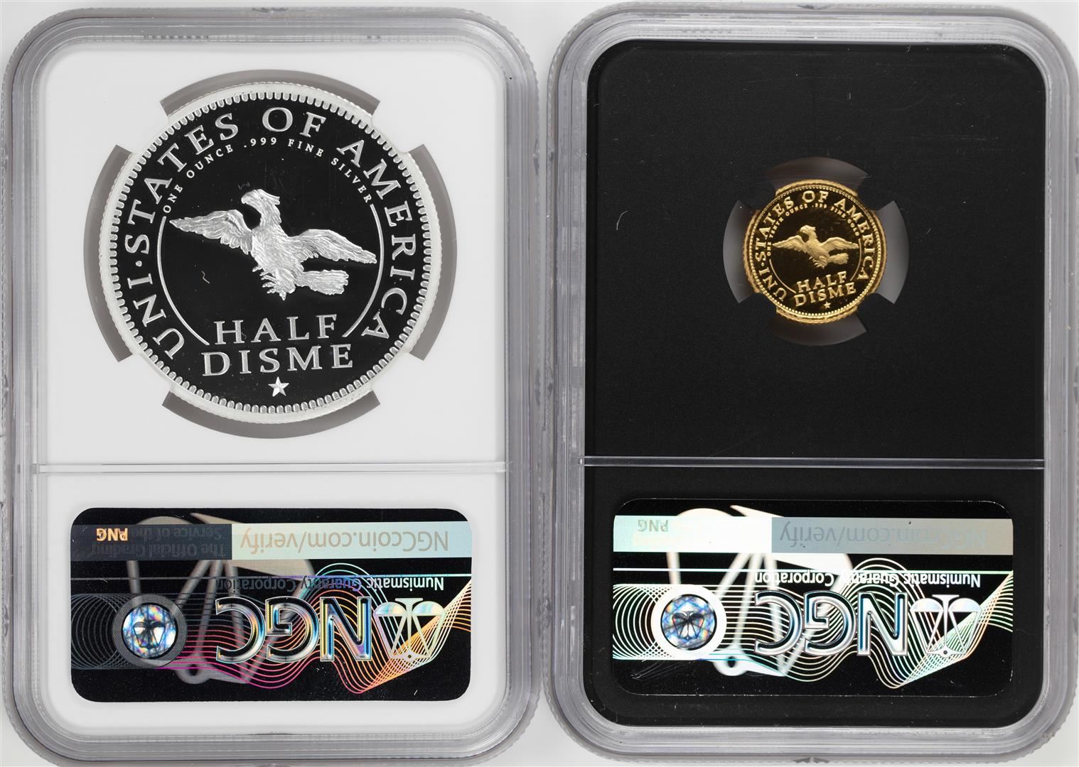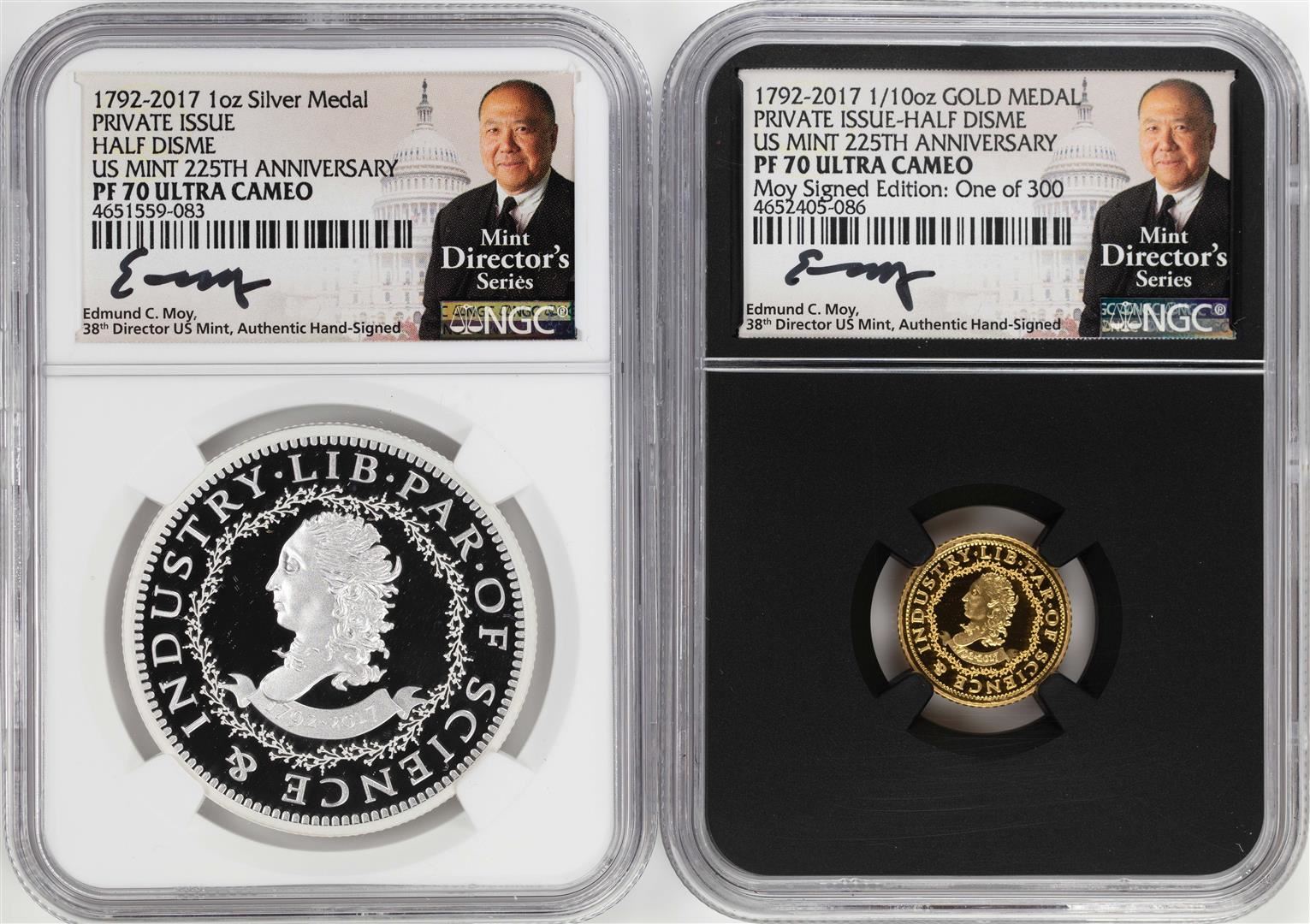 One 1792-2017 Half Disme 1/10 oz. Gold & 1oz. Silver Medals NGC PF70 W/ Moy Signature Set. NGC Certified.