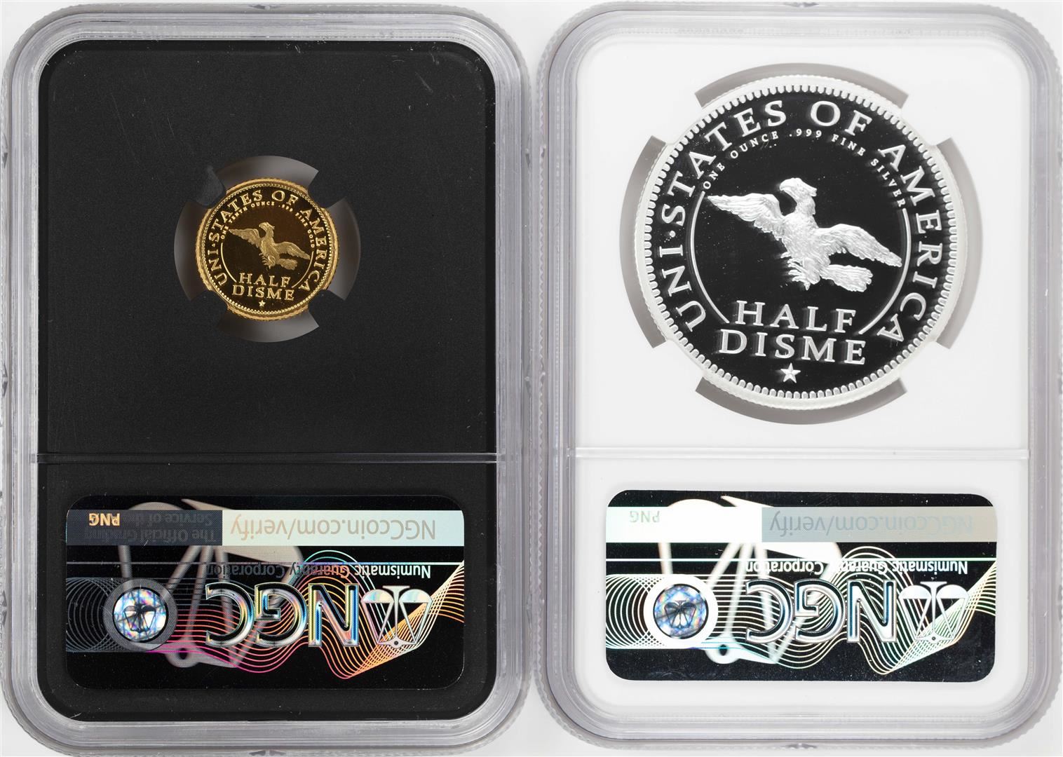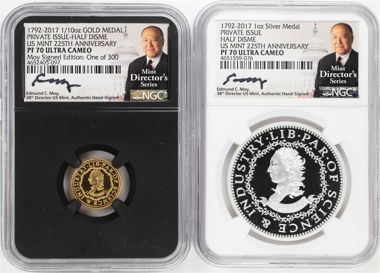One 1792-2017 Half Disme 1/10 oz. Gold & 1oz. Silver Medals NGC PF70 W/ Moy Signature Set. NGC Certified.