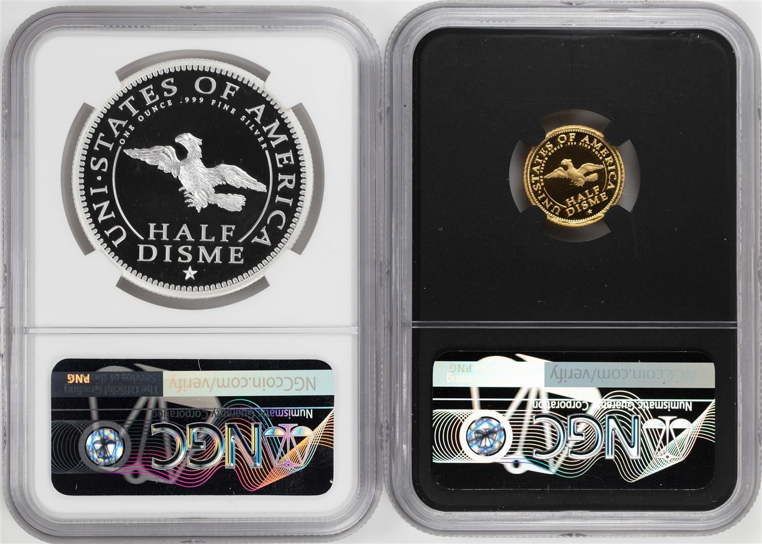 One 1792-2017 Half Disme 1/10 oz. Gold & 1oz. Silver Medals NGC PF70 W/ Moy Signature Set. NGC Certified.