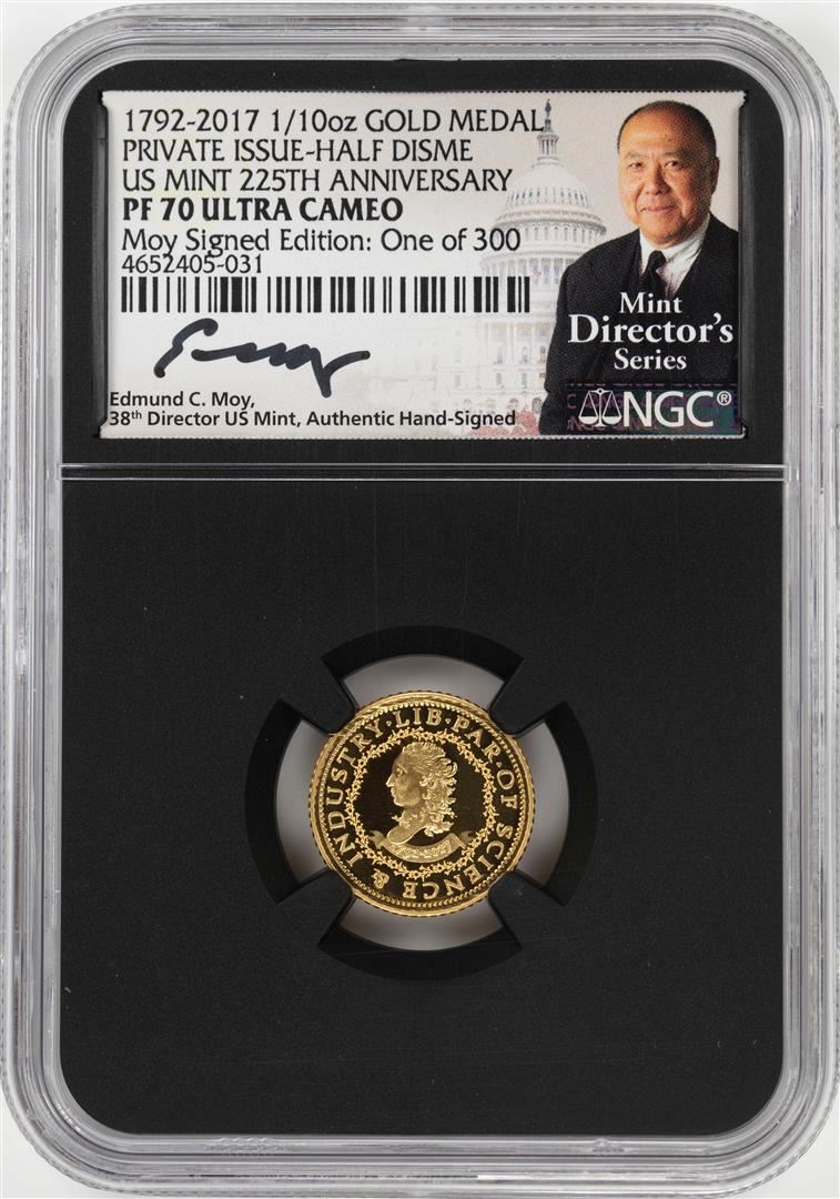 1792-2017 Half Disme 1/10 oz. Gold Medal NGC PF70 W/Edmund C. Moy Signature