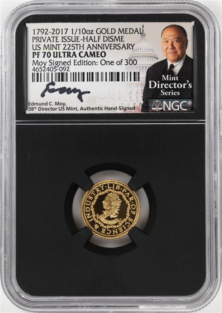 One 1792-2017 Half Disme 1/10 oz. Gold Medal NGC PF70 W/Edmund C. Moy Signature. NGC Certified.