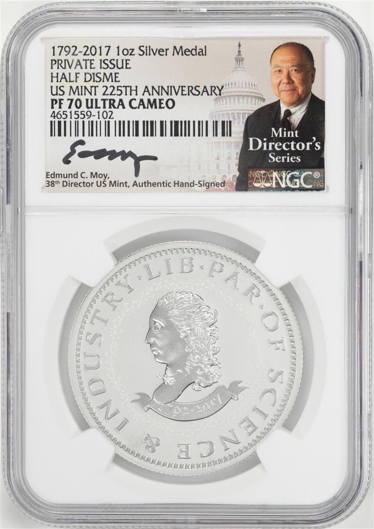 One 1792-2017 Half Disme 1 oz. Silver Medal NGC PF70 W/Edmund C. Moy Signature. NGC Certified.