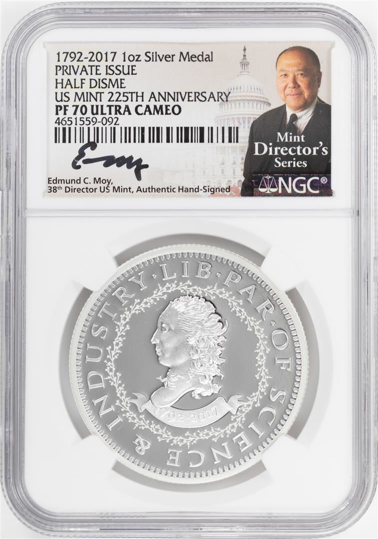 One 1792-2017 Half Disme 1 oz. Silver Medal NGC PF70 W/Edmund C. Moy Signature. NGC Certified.