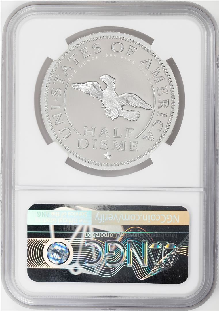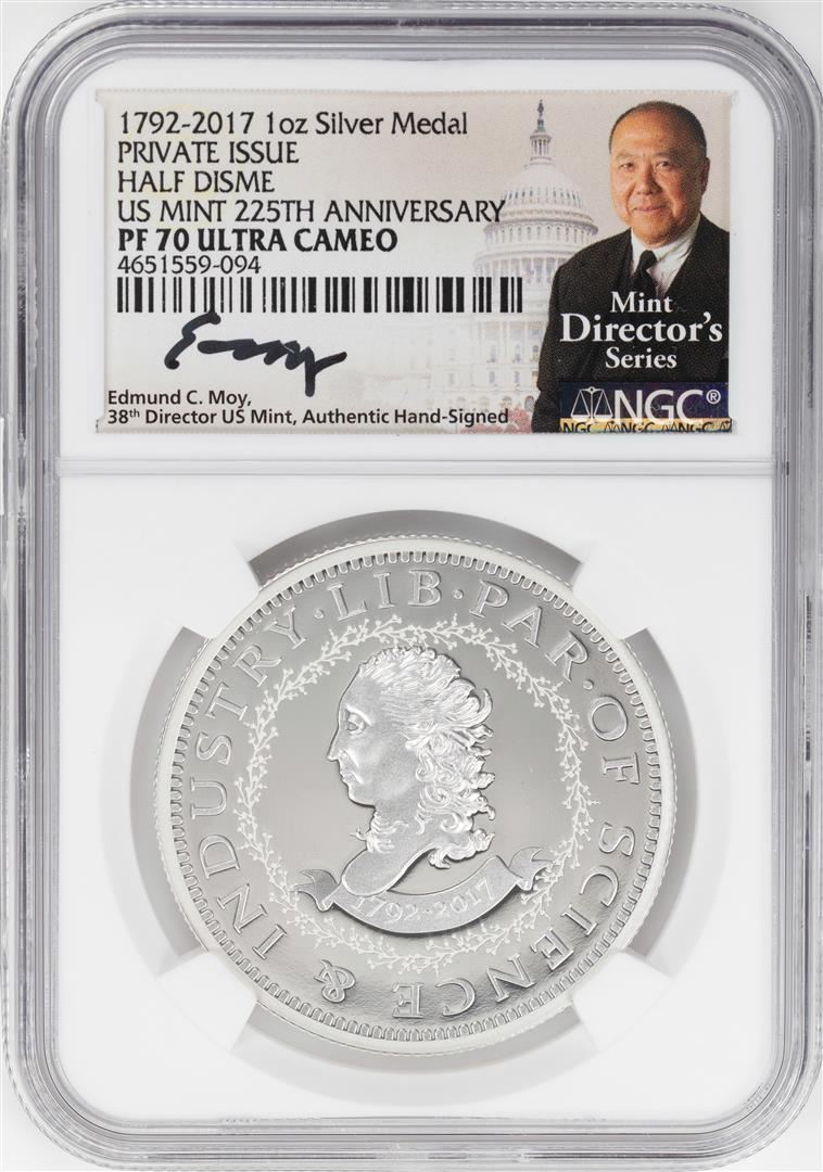 One 1792-2017 Half Disme 1 oz. Silver Medal NGC PF70 W/Edmund C. Moy Signature. NGC Certified.
