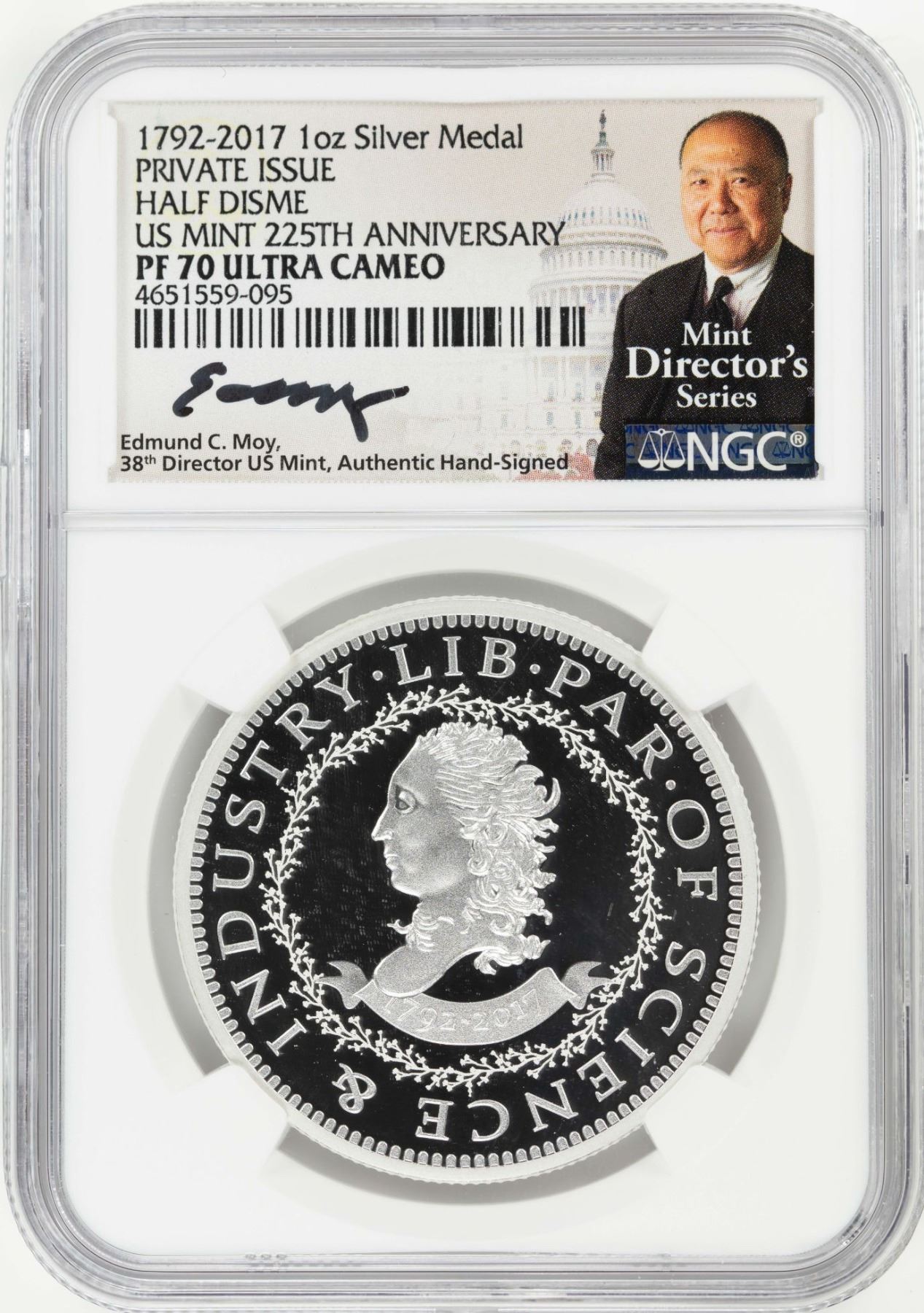 One 1792-2017 Half Disme 1 oz. Silver Medal NGC PF70 W/Edmund C. Moy Signature.