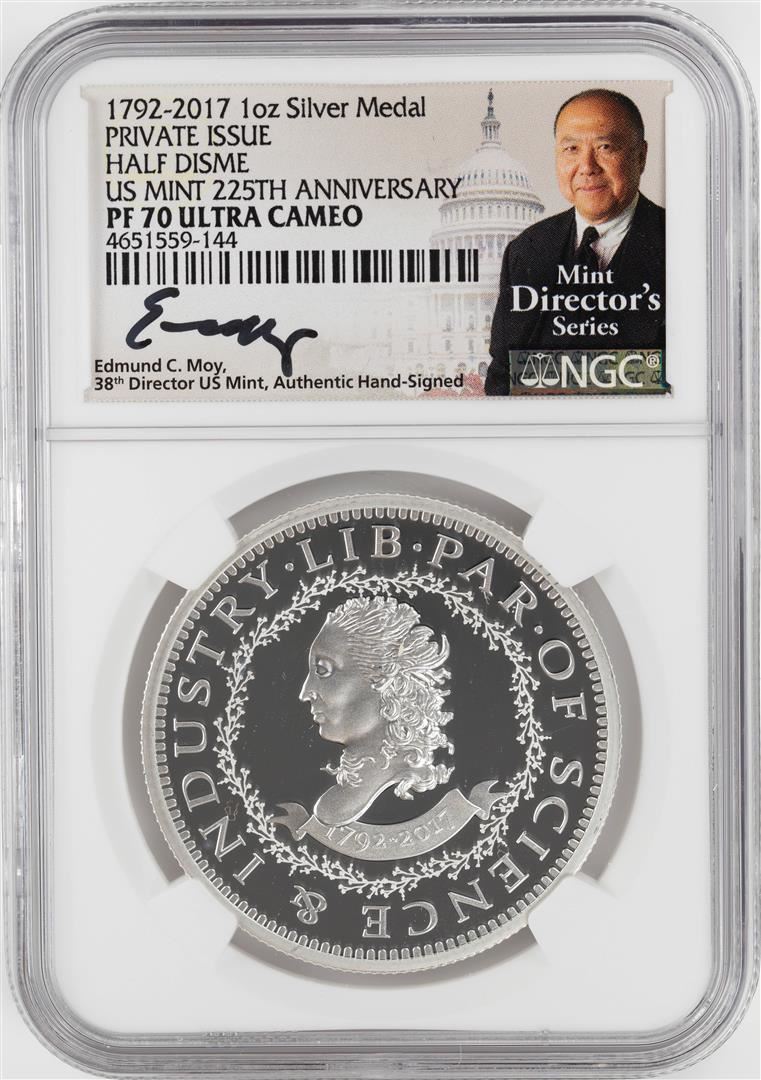 One 1792-2017 Half Disme 1 oz. Silver Medal NGC PF70 W/Edmund C. Moy Signature. NGC Certified.