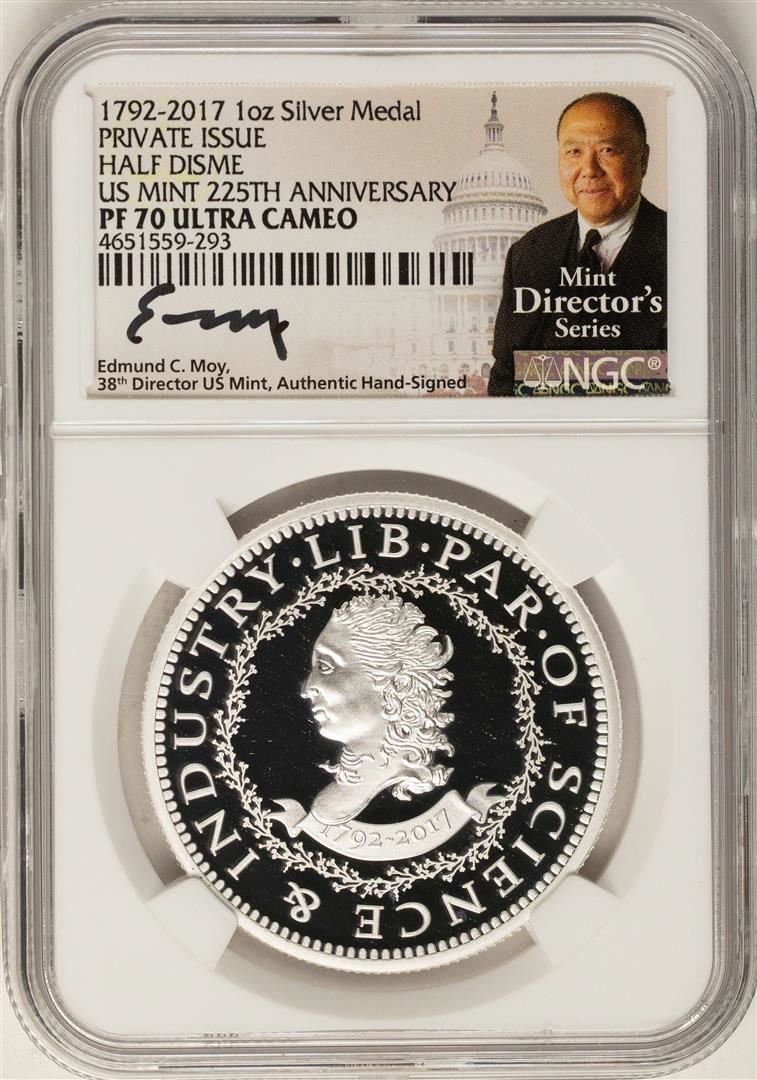 One 1792-2017 Half Disme 1 oz. Silver Medal NGC PF70 W/Edmund C. Moy Signature. NGC Certified.