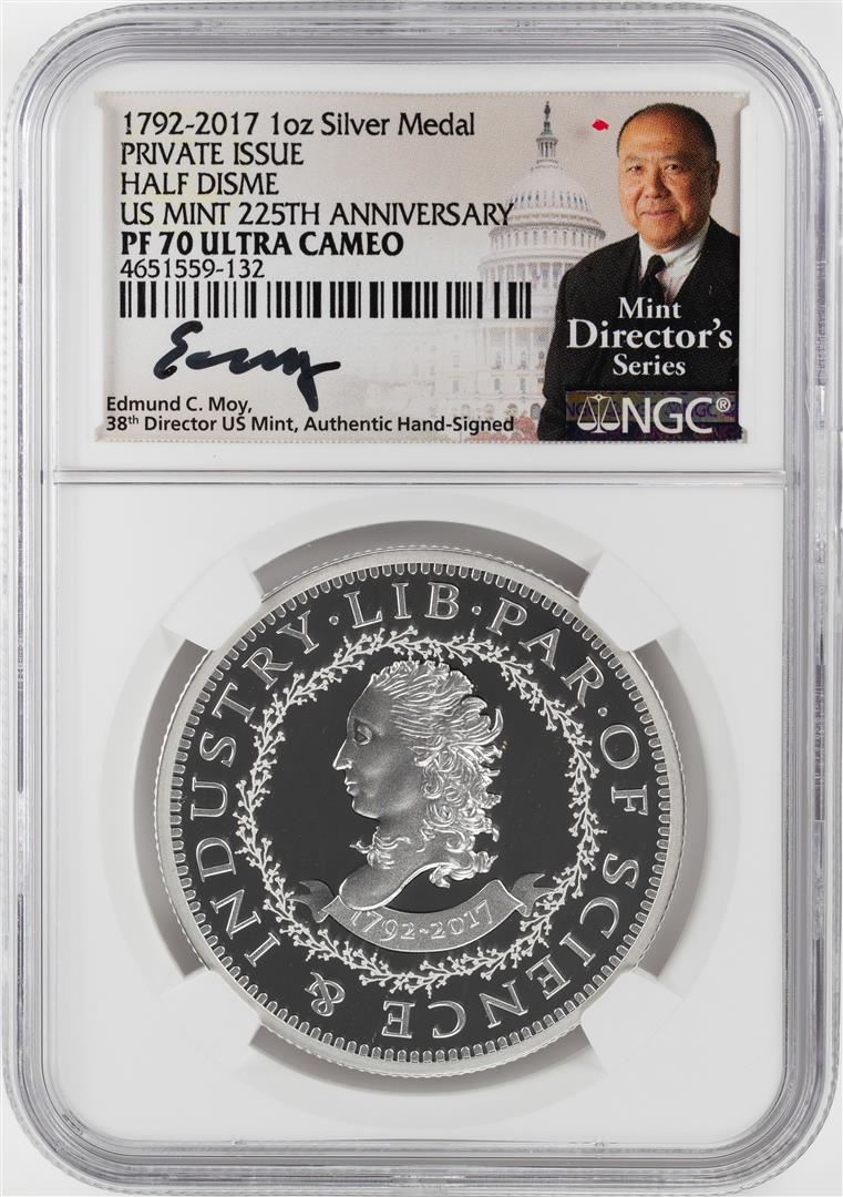 One 1792-2017 Half Disme 1 oz. Silver Medal NGC PF70 W/Edmund C. Moy Signature. NGC Certified.