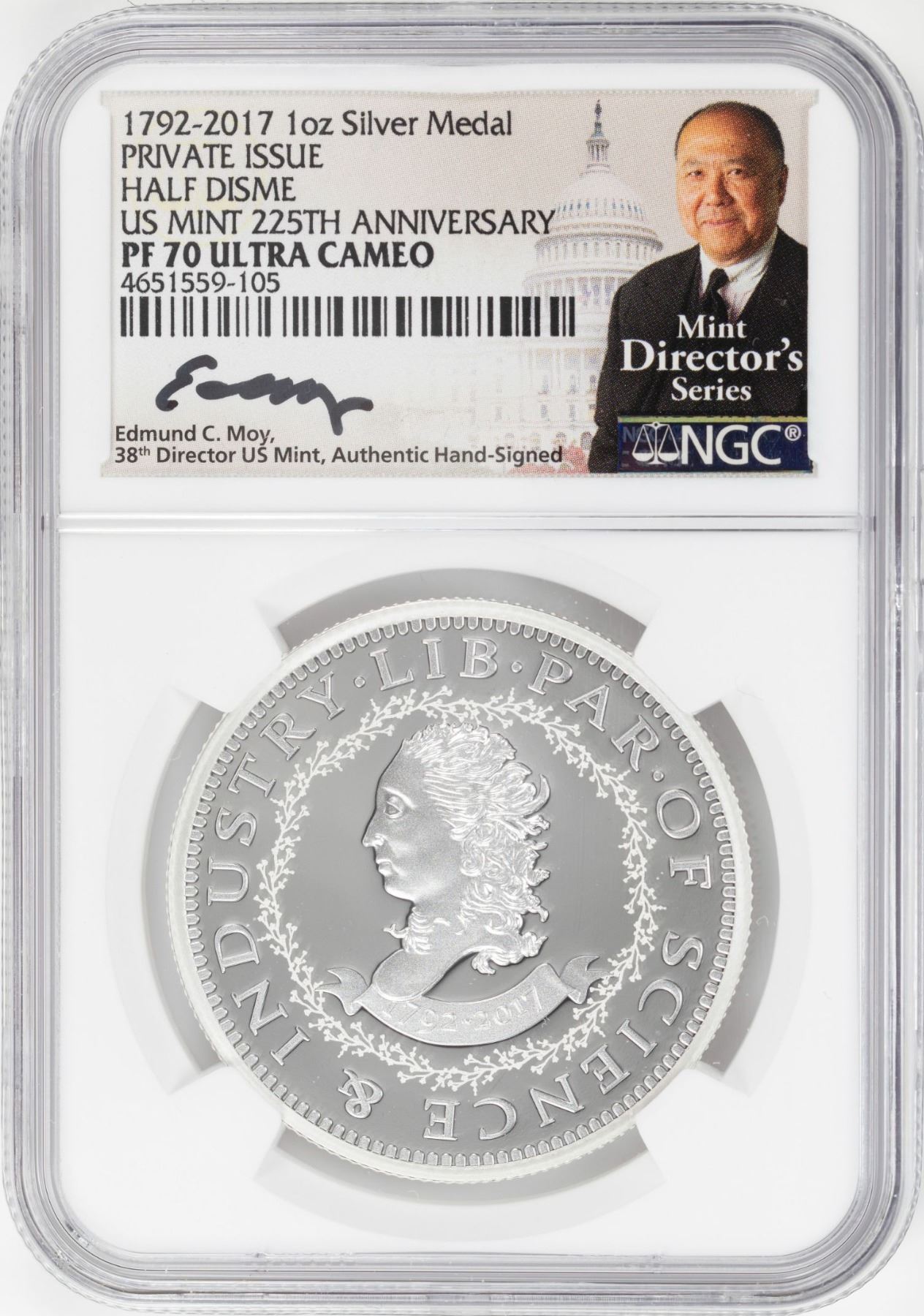 One 1792-2017 Half Disme 1 oz. Silver Medal NGC PF70 W/Edmund C. Moy Signature.