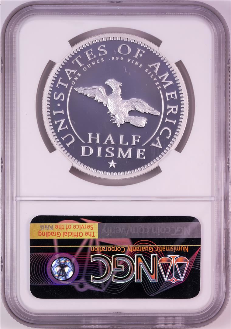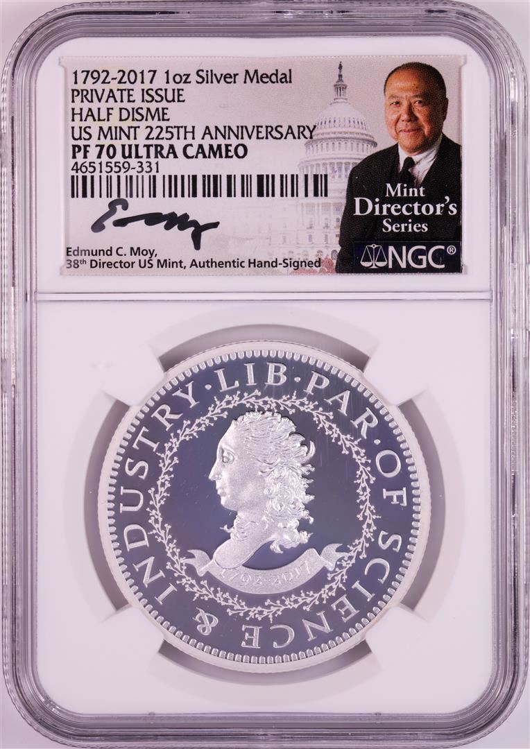 One 1792-2017 Half Disme 1 oz. Silver Medal NGC PF70 W/Edmund C. Moy Signature. NGC Certified.