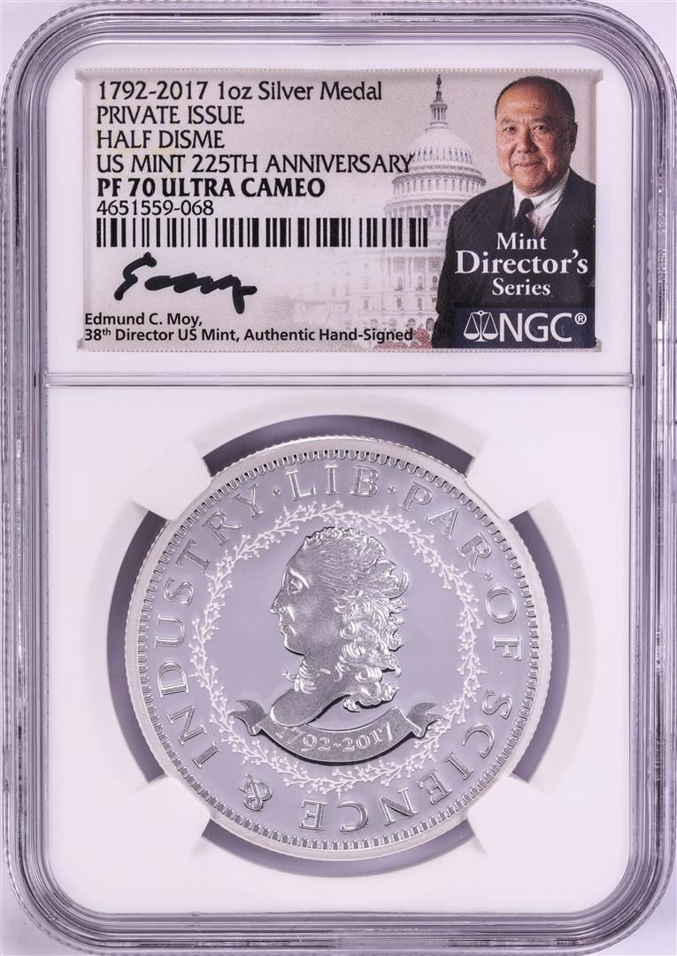 One 1792-2017 Half Disme 1 oz. Silver Medal NGC PF70 W/Edmund C. Moy Signature. NGC Certified.