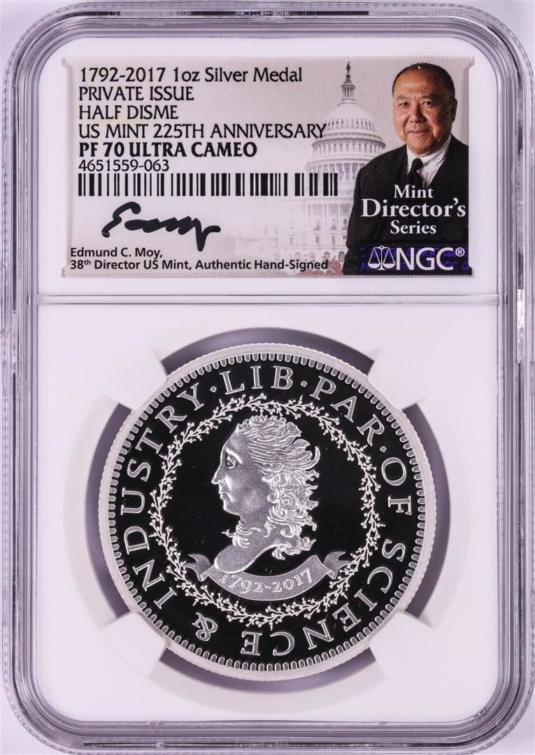 One 1792-2017 Half Disme 1 oz. Silver Medal NGC PF70 W/Edmund C. Moy Signature. NGC Certified.