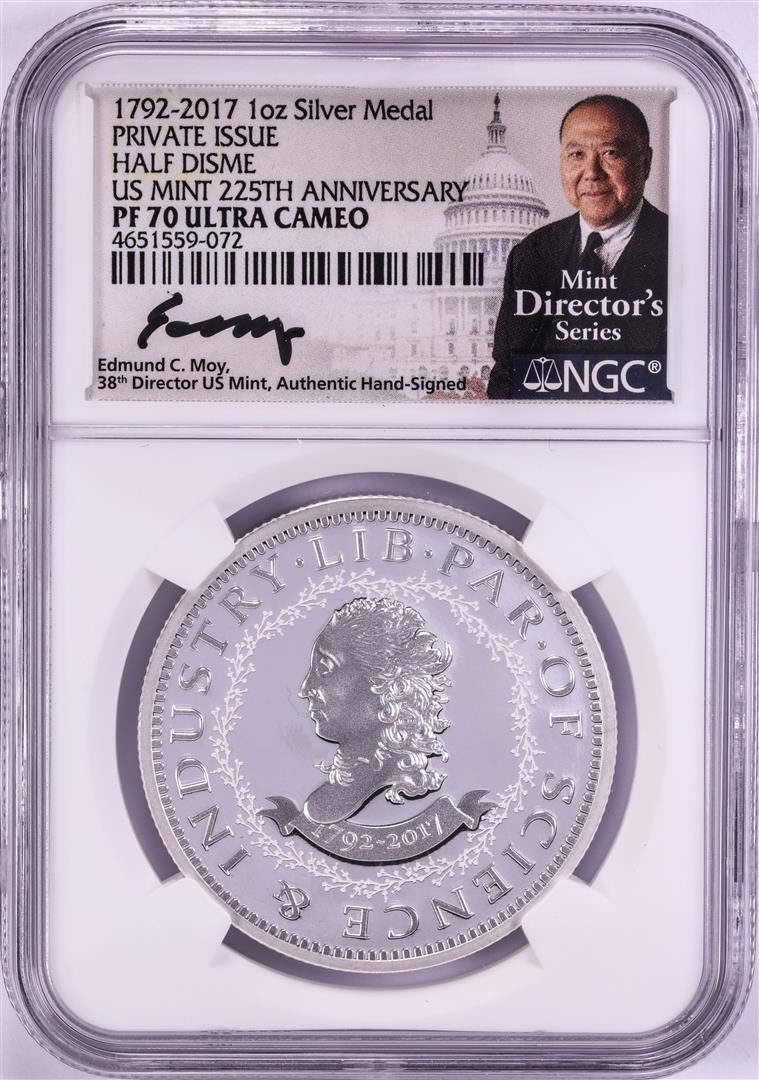One 1792-2017 Half Disme 1 oz. Silver Medal NGC PF70 W/Edmund C. Moy Signature. NGC Certified.