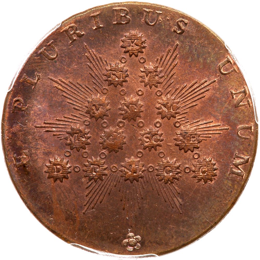 1792-4 Kentucky Cent with Lettered Edge Breen-1156, W-8810 PCGS graded MS63 RED. Lustrous mellowed red fading to light bluish steel with about 70% of the planchet retaining mint color. The only defects are some very tiny planchet fissures in the fields on the obverse scroll side, but you need a glass to see them. Usual die state for the variety with a fine die crack that meanders through the scroll. Struck with a lettered LANCASTER edge, and this feature is noted on the PCGS label. A premium example of this popular copper that was used in Colonial America. PCGS population 9; 42 finer: 34 in 64RD, 8 in 65RD. PCGS #625. Estimated Value 1,000 - UP