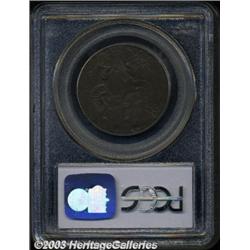 1792 50C Washington Getz Pattern Half Dollar, Small Eagle, Copper--Flip Over, Double Strike--VG10 PCGS. This 1792 Getz copper half dollar shows a dramatic flipover double strike. The surfaces are medium-dark, with even brown coloration. The reverse of the first strike is quite visible with the eagle's head replaced by that of George Washington. The date of the second strike is barely visible at the bottom of that side. The other side mostly shows the reverse of the second strike, though with a light ghost of Washington's head superimposed on that of the eagle. The PCGS holder says the coin has a lettered edge but the edge is, of course, not accessible. The consignor states the edge lettering says ONE HUNDRED FOR A DOLLAR, indicating it was struck over a large cent. This will surely be a coin that will be vigorously pursued by specialists in a variety of fields including Washingtonia, patterns, and errors. The only specimen Breen mentions with a lettered edge was struck over a U.S. large cent of 1794 or 1795. Wear makes it difficult to determine whether this specimen is Breen 1352, one of the original group that Breen estimates as 100-150 pieces originally struck, or a slightly later strike, i.e., Breen 1355-6. The planchet on this specimen is only about 30 mm in diameter, suggesting that it may well be one of a small group of pieces struck a couple of years after 1792, perhaps overstruck on a large cent. A handful of specimens are known overstruck on a variety of silver or copper coins or planchets other than the standard 35 mm silver or copper planchets. The 30 mm planchet results in the tops of the legends being off the planchet. A complete study of this coin will require removal from the slab. Whether struck in 1792 or 1795, it remains a rare and desirable artifact of this nation's early attempts at developing a federal coinage. The flipover double strike only adds to the excitement of viewing (or owning) this coin.Ex: Thomas Elder's Sale of October 28, 1928. Important notice: Heritage usually auctions material at the rate of 200-250 lots per hour. On some occasions eBay Live bid software or the Internet may not be able to keep up with the pace of the auction. We recommend placing a realistic absentee bid now as insurance to avoid disappointment. Occasionally the auctioneer may eliminate or reject an eBay Live bid, and the auctioneer may also reopen a lot after the close of the eBay live bidding (usually because we missed an audience bid), and may reject your bid even if it shows you as the winning bidder. By bidding via eBay Live, you agree that Heritage may award the lot to another bidder at its sole discretion under the circumstances described above or any other reasonable circumstances. Also please note that all Heritage lots purchased through eBay Live carry a 20% Buyer's Premium. Please make sure you read the Terms and Conditions before you bid.