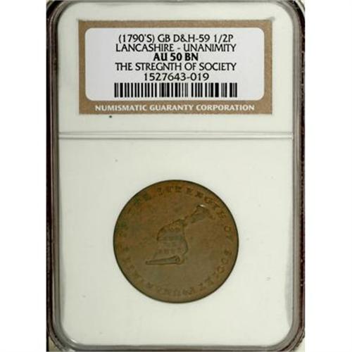 <B>(1790-S) 1/2P Kentucky, Lancashire- Unanimity Token--GB D&H-59 AU50 NGC. </B></I>Ex: The Strength of Loyalty.<BR><BR><b>Shipping:</b> Coins & Currency (<a target="_blank" href="http://www.heritageauctions.com/common/shipping.php">view shipping information</a>)