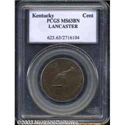 (1792-94) TOKEN Kentucky Token, LANCASTER Edge MS63 Brown PCGS. Breen-1156. Produced in England and technically a Conder token, but long popular among Early American specialists due to the design's focus on the United States. A well struck piece with attractive chestnut-brown surfaces that will please even the most demanding collector. A series of spindly die cracks (as made) originate in the obverse center. Listed on page 55 of the current Guide Book. Important notice: Heritage usually auctions material at the rate of 200-250 lots per hour. On some occasions eBay Live bid software or the Internet may not be able to keep up with the pace of the auction. We recommend placing a realistic absentee bid now as insurance to avoid disappointment. Occasionally the auctioneer may eliminate or reject an eBay Live bid, and the auctioneer may also reopen a lot after the close of the eBay live bidding (usually because we missed an audience bid), and may reject your bid even if it shows you as the winning bidder. By bidding via eBay Live, you agree that Heritage may award the lot to another bidder at its sole discretion under the circumstances described above or any other reasonable circumstances. Also please note that all Heritage lots purchased through eBay Live carry a 20% Buyer's Premium. Please make sure you read the Terms and Conditions before you bid.
