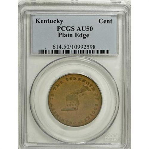 <B>(1792-94) TOKEN Kentucky Token, Plain Edge AU50 PCGS.</B></I> Breen-1155. This luminous, lightly circulated token is predominantly nutmeg-brown with a few areas of deeper color. Highpoint softness is noted on the obverse, with the word CAUSE nearly missing from the scroll. Listed on page 71 of the 2008 <I>Guide Book</B></I>.<BR><I>From The Beau Clerc Collection.</B></I><BR><BR><b>Shipping:</b> Coins & Currency (<a target="_blank" href="http://www.heritageauctions.com/common/shipping.php">view shipping information</a>)