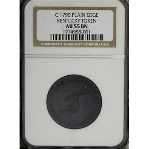<B>(1792-94) TOKEN Kentucky Token, Plain Edge AU55 NGC.</B></I> Breen-1155. The smooth brown surfaces show little sign of wear, and the fields reveal no mentionable abrasions. Some strike softness in the center, however, makes OUR CAUSE only faintly readable. A well centered and attractive piece. Listed on page 71 of the 2008 <I>Guide Book.</B></I><BR><BR><b>Shipping:</b> Coins & Currency (<a target="_blank" href="http://www.heritageauctions.com/common/shipping.php">view shipping information</a>)