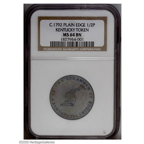 <B>(1792-94)<TOKEN> Kentucky Token, Plain Edge MS64 Brown NGC.</B></I> Breen-1155. Nearly full prooflike fields with deep brown color and hints of pale blue peripheral toning. This is a highly attractive example despite a few minor surface marks here and there. Light die cracks are visible in the obverse fields. Listed on page 71 of the 2006 <I>Guide Book.</B></I>