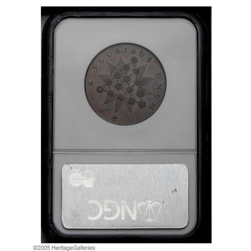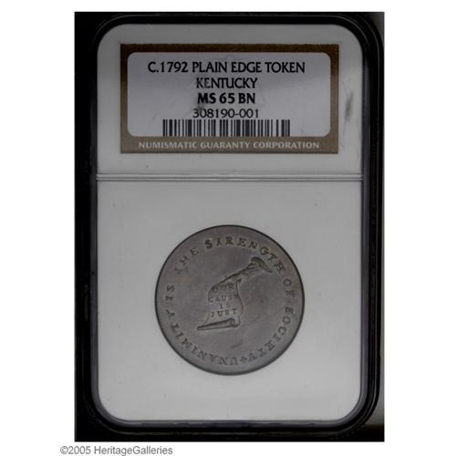 <B>(1792-94)<TOKEN> Kentucky Token, Plain Edge MS65 Brown NGC.</B></I> Breen-1155. The rich golden-brown surfaces acquire plum and ocean-blue tints when the piece is reflected beneath a light. This mildly prooflike Gem is intricately struck, even on CAUSE, which usually shows some weakness. The reverse is not far from pristine, and the obverse has only a small number of trivial marks. Listed on page 71 of the 2006 <I>Guide Book.</B></I>