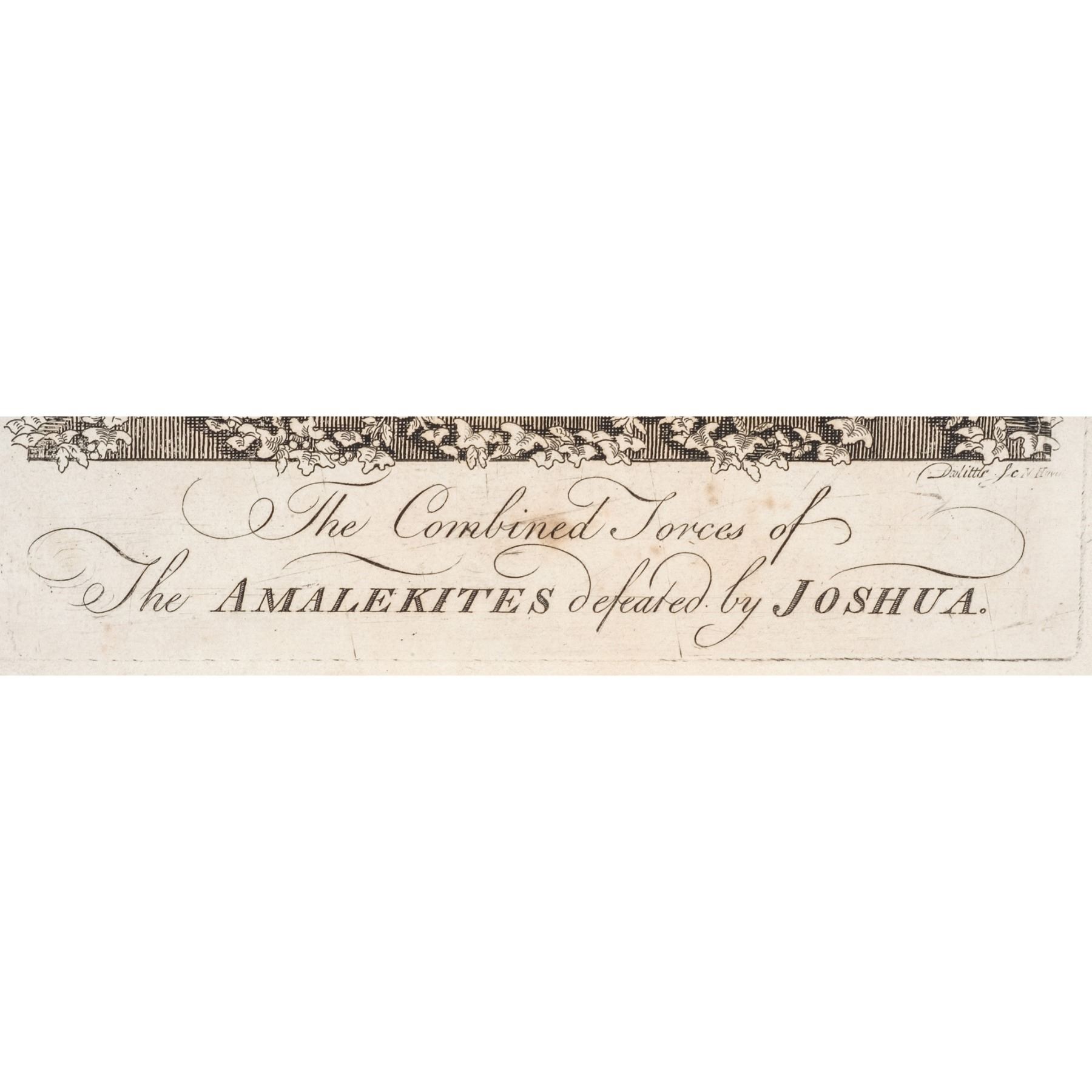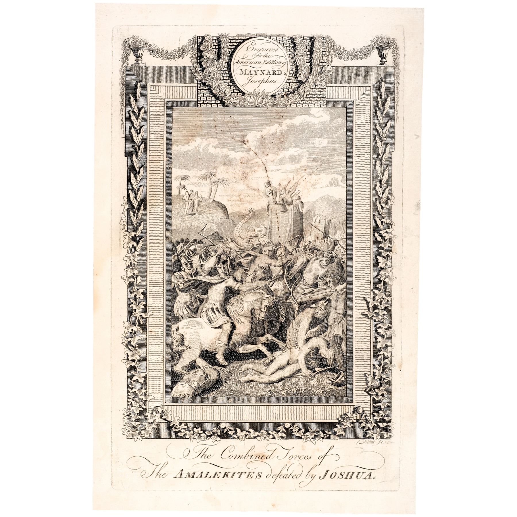 1792 AMOS DOOLITTLE American Revolutionary War Patriot, Colonial Artist and Engraver, Engraved Copper Plate Print titled, “The Combined Forces of The AMALEKITES defeated by JOSHUA” American Edition of MAYNARD’s “Josephus”, Signed within the plate “Doolittle Sclp.”, measuring 12” x 8”, Extremely Fine.
