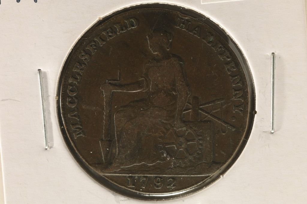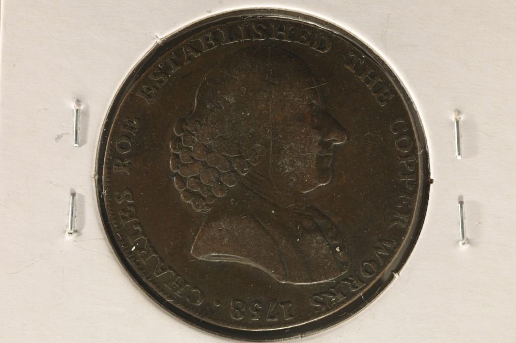 PROVINCIAL TOKENS PRIVATELY MINTED TOKEN COINAGE STRUCK AND USED DURING THE LATTER PART OF THE 19TH CENTURY IN ENGLAND. SIMILAR TO OUR CIVIL WAR AND HARD TIMES TOKENS "CHARLES ROE ESTABLISHED THE COPPER WORKS ON ONE SIDE AND MANSFIELD HALFPENNY