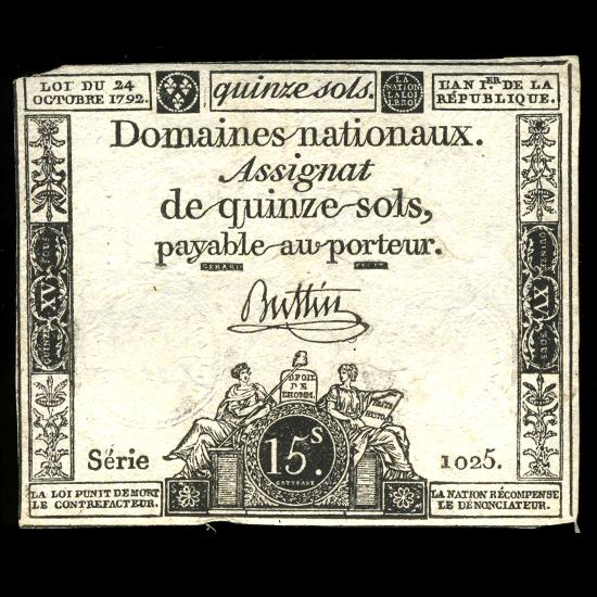 1792 France RARE 15 Sols Assignat Currency AU+ (CUR-05886)