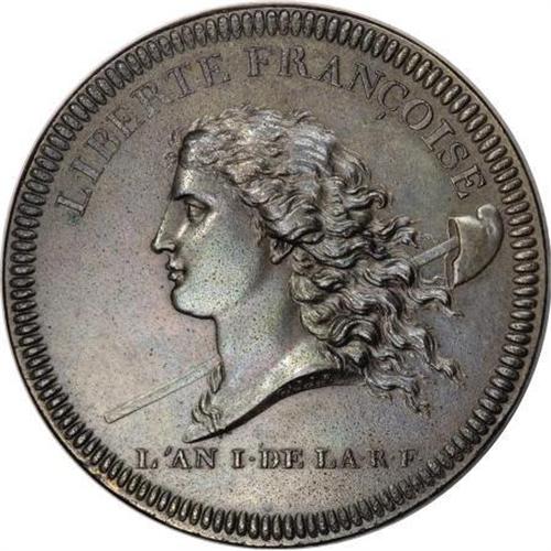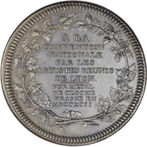 <B>1792 French </B></I><B><I>Liberte Francoise</B></I></B></I><B> Medal.</B></I> Hennin 387, Maz 318, VG 338, 39 mm. French medal, LA CONVENTION, LIBERTE FRANCOISE, bell medal dated 1792 by Andre Galle, head of Liberty facing left, with flowing hair, behind her a staff topped with a Phrygian cap, L'AN I DE LA. R.F. ("first year of the French Republic"), rev. legend within wreath, A LA CONVENTION NATIONALE PAR LES ARTISTES REUNIS DE LYON-PUR METAL DU CLOCHE FRAPPE EN MDCCXCII ("To the national convention of artists from the united artists of Lyon--Pure bell metal struck in 1792." [From revolutionary times in France.]<BR><I>From The Madison Collection.</B></I><BR><BR><b>Shipping:</b> Coins & Currency (<a target="_blank" href="http://www.heritageauctions.com/common/shipping.php">view shipping information</a>)