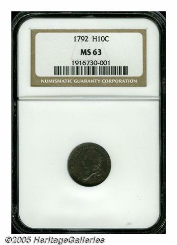 <B>1792<H10C> Half Disme, Judd-7, Pollock-7, R.4, MS63 NGC.</B></I> For the past 150 years, these coins have intrigued collectors as well as Mint officials. Much has been written about the origins of the half dismes, some of it embellishment, some outright fabrication. The real breakthrough in research seems to have come in the past ten years, the results of which were published in the ANS' <I>American Journal of Numismatics 15"</B></I> for 2003. In that article, the authors, Joel Orosz and Carl Herkowitz, explore all aspects of the production of these first official United States coins. The article, "The Fabled 1792 Half Dimes," is well worth the effort for anyone interested in early U.S. coinage. The authors discovered an obscure reference to a tipped-in note that was discovered in a European coin book in 1943 and the contents of the note were subsequently published in <I>The Numismatist.</B></I> A subsequent misinterpretation of the author of the note by Charles McSorley, Jr. led to one of the major pieces of misinformation regarding the 1792 half dismes. McSorley misidentified the author of the note as officer and refiner in the Mint, Jonas R. McClintock. The signature was faded and only read J--Mc--. Orosz and Herkowitz identified the actual author of the note as John McAllister, Jr., a fascinating individual who was a close friend of Adam Eckfeldt, who was present at the striking of the 1792 half dismes. The actual content of the tipped in note reads, "In conversation with Mr. Adam Eckfeldt (Apr 9, 1844) at the Mint, he informed me that the Half Dismes above described, were struck, expressly for Gen. Washington, to the extent of One Hundred Dollars, which sum he deposited in Bullion or Coin, for the purpose. Mr. E. thinks that Gen. W. distributed them as presents. Some were sent to Europe, but the greater number, he believes, were given to friends of Gen. W. in Virginia. No more of them were ever coined. They were never designed as Currency. The Mint was not, at the time, fully ready for being put into operation. The Coining Machinery was in the cellar of Mr. Harper, saw maker, at the corner of Cherry and 6th Sts, at which place these pieces were struck."<BR> While the facts in the note above may have been well known to a small group in the mid-1840s, later retellings of the story stretched and greatly enhanced the basic facts until the present day, when it is still believed by many that Martha Washington was the model for the figure of Liberty, the coins were struck from Washington's Sheffield silver plate, only $75 worth of coins were struck, and that George and Martha were in attendance when the coins were presented. Skipping to the end of this masterful article, Orosz and Herkowitz conclusions are:<BR><BR> The half dismes were not struck from sterling silver or silver-plated tableware but rather, as Eckfeldt states, from bullion or coin.<BR> The half dismes survive today at an unusually high rate, consistent with early presentation to at least some degree.<BR> The amount struck (1500 pieces or $75) is consistent with an initial deposit of $100, with the loss due to preparation.<BR> After the planchets were prepared, they were deposited with the cabinet officer in charge of the Mint. Jefferson personally delivered the blanks to the Mint to be struck, and the struck coins were returned to his care.<BR> Jefferson recorded all transactions regarding the 1792 half dismes as private records, not public records.<BR><BR> As noted above, numerous half dismes were handed out as favors by George Washington, while others were shipped to Europe. This particular piece must have been highly prized by its owner, as it is in essentially the same condition as when it left John Harper's saw shop 113 years ago. The only difference is the addition of multiple layers of gray, blue, and golden toning over each side. Magnification shows a few light abrasions, but none that are worthy of individual mention. The striking details on the obverse are stronger than on the reverse. Also worthy of note is the absence of the planchet flakes that are usually seen on half dismes. This is one of the finest pieces known of this historic issue. NGC has only graded one other piece MS63 with seven finer, while PCGS has certified three with six finer (4/05).