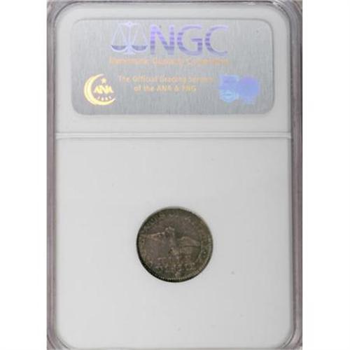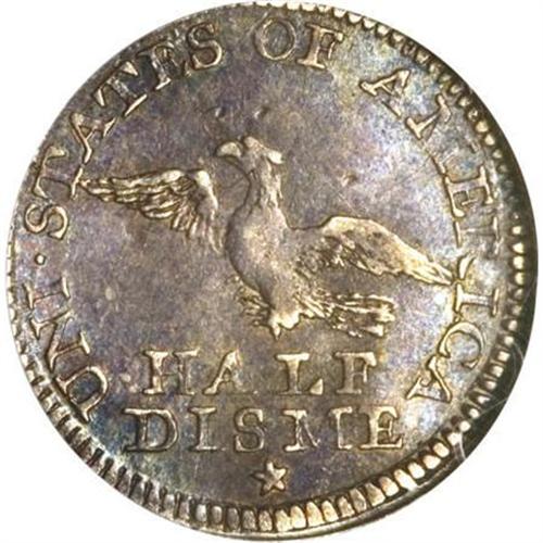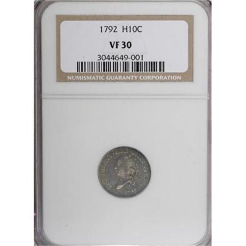 <B>1792 H10C Half Disme, Judd-7, Pollock-7, R.4, VF30 NGC.</B></I> The 1792 half disme reflects the tentative beginnings of the early Mint and the challenges that designers and engravers had in transforming the necessary symbolism supported by America's founding fathers into handsome designs. That the early coinage would feature Liberty was a given after it was decided that the portrait of Washington, or any other president was not suitable for circulating coinage. The selection of the eagle for the reverse was more problematic. <BR> The absence of a national coat of arms which artists could replicate in whole or in part demanded the selection of a motif capable of conveying the authority of a new country. The eagle, now a familiar symbol of American power, was selected more by a process of elimination than by an affirmative designation. A January 1791 report by the Secretary of the Treasury, Alexander Hamilton noted that "The eagle is not a very expressive or apt appellation for the largest gold piece, but nothing better appears..." For the past two centuries, numismatic artists in America have been interpreting the motifs of Liberty and the eagle with varying success.<BR> Cornelius Vermeule, in his opus <I>Numismatic Art in America, </B></I>commented on the aesthetic challenges of this early issue. He wrote, "The bust of liberty, labeled 'Parent of Science and Industry,' is an unflattering cross between Martha Washington and one of the wild-eyed harridans who knitted while heads rolled during the French Revolution." Regarding the reverse, he commented that it resembled, "...an ailing barnyard fowl, with undersized wings spread at odd angles, curving neck, and oddly foreshortened body, a creature nowhere better seen than on the small surfaces of the dime and half-dime." Certainly, this design is not beautiful by traditional standards, yet its charm is undeniable.<BR> This example is absolutely exceptional for the grade. Its surfaces are a handsome deep charcoal-gray with golden undertones that liven up the peripheries. It is free of the issues or distracting problems that plague these early coins, and it exhibits no distracting marks worthy of individual mention. The wear is even and the strike is uniform, resulting in rewarding detail remaining in the hair, and a strong profile to admire. A lively example that will certainly attract well-deserved attention when it crosses the auction block. <BR><BR><b>Shipping:</b> Coins & Currency (<a target="_blank" href="http://www.heritageauctions.com/common/shipping.php">view shipping information</a>)