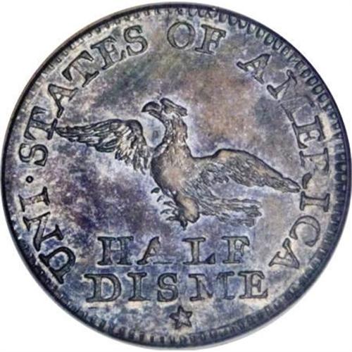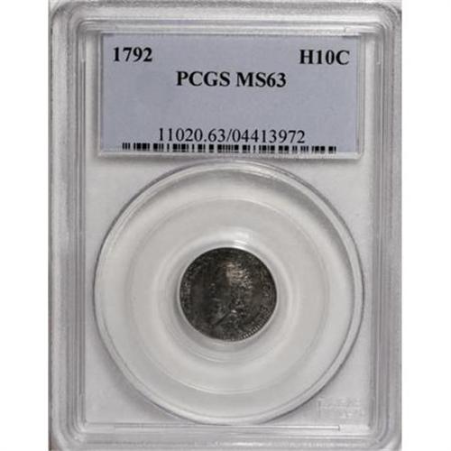 <B>1792 H10C Half Disme, Judd-7, Pollock-7, R.4, MS63 PCGS.</B></I> Vast amounts of myth, lore, and legend surround this early U.S. issue, struck before the first U.S. Mint in Philadelphia was completed. The 1792 half disme (correctly pronounced as the French would, "deem" rather than "dime" or "diz-me"), is listed as Number 18 in Jeff Garrett and Ron Guth's <I>The 100 Greatest U.S. Coins</B></I>. (In a bit of cognitive dissonance, it is opposite Number 17, the double thick Ultra High Relief double eagle pattern that is the diameter of a ten dollar gold piece--about as different as two coins can get.) <BR> The authors delve into the question of whether the 1792 half dismes should be considered "pattern" coins or not:<BR><BR> "Generally, Pattern coins are struck in extremely limited quantities (usually fewer than a dozen pieces) just to test how a design will appear in coin form. A mintage of 1,500 pieces suggests that the 1792 Half Disme was much more than just a Pattern, but because they were struck outside the U.S. Mint, because no other Half Dimes were made until 1794, and because the 1792 Half Dismes were not monetized through official channels (as were 'real' coins later on), most numismatists consider them to be Patterns. Some experts consider them quasi-official coins, and a smaller group considers them to be one of the first 'real' coins made by our U.S. government. Perhaps the best test is that these did indeed circulate as coins, and in December 1792, in his message to Congress, President Washington specifically stated that they had been made as regular coinage. Thus, it is only logical that most known pieces show signs of extensive wear.<BR> "Another way to approach the question is to point out the existence of a unique 1792 Half Disme struck in pure copper. Such a piece indicates that the dies were first tested on a blank of base metal, the designs and striking qualities were approved, and a production run of 1,500 Half Dismes began. If the copper piece were the Pattern (or a Die Trial), how can the silver versions that followed be anything other than 'real' coins?"<BR><BR> The comments from Garrett and Guth are interesting in numerous ways. While trying to please all comers, they simultaneously manage to come down squarely in the camp of that "smaller group" that "considers them to be one of the first 'real' coins" made by the fledgling government. In addition, while Garrett and Guth note that most survivors show extensive wear--which is true--it is also recorded that President George Washington handed out numerous examples as souvenirs. The certified population (which is probably the top end of surviving examples) shows that there are quite a few Mint State pieces known--evidence that the original recipients mostly cherished these historic numismatic presents from our nation's first president.<BR> Judging by the record prices that these incredibly popular 1792 half dismes have brought in recent years, it appears that not a "smaller group," but rather legions of collectors agree with Garrett and Guth that these pieces were "regular" U.S. coinage. Witness the incredible sum of $1,322,500 that the phenomenal Floyd Starr specimen, graded Specimen 67 by PCGS, brought in Heritage's CSNS Signature Auction (4/2006, lot 1860), listed in the 2008 <I>Guide Book</B></I> as the #16 top U.S. coin price realized. (Subsequent sales in 2007 have now altered those auction rankings.) <BR> The PCGS online <I>Population Report</B></I> has a section on "Patterns, Experimental Pieces, and Die Trials" (in which are listed many of the other 1792 issues, much more widely considered true patterns). However, the "Bust Half Dime (1792)" is listed just before other circulation strike types in the half dime series. If one clicks that category, the Starr coin will be listed separately as a Specimen strike, and under Mint State pieces PCGS currently shows three coins graded in MS63, with 11 better (finest an MS67). NGC online Census Report (which lists "Early Half Dimes 1792-1837" under circulation strikes) shows two pieces graded MS63, with seven finer (finest an MS68) (11/07).<BR> The present MS63-graded PCGS example is thus one of five coins so graded at both services. Such coins are regularly bringing sums well into the six figures, further testament in this cataloger's opinion to the coins' status as the first official circulation issue of the United States. <BR> This coin likely was one of those presentation pieces from President Washington, as it has been carefully and meticulously maintained. The silver-gray surfaces offer lovely underlying luster and deep, mottled violet, golden, and russet toning. A few small planchet flaws, often seen on these coins, are observed in the upper right obverse field, and there are light adjustment marks, as made, on Liberty's cheek. A couple of peripheral letters show strike weakness--the tops of NCE on the obverse, (E)R(I) and the A and M in the denomination. But the overall strike quality is quite pleasing, with good articulation in Liberty's hair and most of the eagle's feathers save in the immediate center. A tiny verdigris spot in the lower loop of B in LIB will identify this coin in the future. But the overall indelible impression that this memorable coin creates is one of evident originality, extreme quality and historical significance, and rarity--qualities too seldom offered in today's active numismatic marketplace.<BR><I>From The Madison Collection.</B></I><BR><BR><b>Shipping:</b> Coins & Currency (<a target="_blank" href="http://www.heritageauctions.com/common/shipping.php">view shipping information</a>)