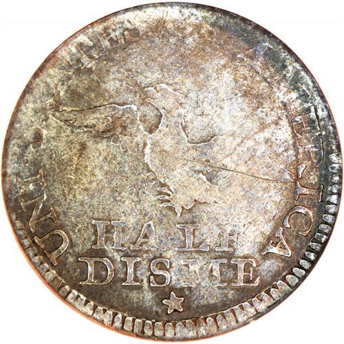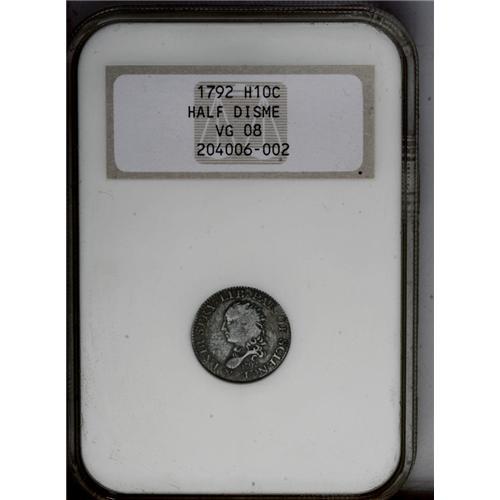 <B>1792<H10C> Half Disme, Judd-7, Pollock-7, R.4, VG8 NGC.</B></I> It is always a special event when even a single 1792 half disme is offered in an auction, but the present sale has three different examples ranging from a Superb Specimen-67 grade coin, down to a more affordable holed example. This third piece also falls in the more affordable category. Although both sides have numerous wispy hairlines, the deep steel toning subdues their appearance, and makes this example a completely desirable specimen. The obverse is nicely detailed, while the upper right part of the reverse is poorly defined, as usual for examples at this grade range. An historic coin that is considered by most to be the first official coin of the United States. For the interested reader, extensive historical information is provided in our description of the Specimen example in this catalog.<BR><I>From The Steve Glenn Collection.</B></I> <BR><BR><B>Important notice:</B> Heritage usually auctions material at the rate of 200-250 lots per hour. On some occasions eBay Live bid software or the Internet may not be able to keep up with the pace of the auction. We recommend placing a realistic absentee bid now as insurance to avoid disappointment. Occasionally the auctioneer may eliminate or reject an eBay Live bid, and the auctioneer may also reopen a lot after the close of the eBay live bidding (usually because we missed an audience bid), and may reject your bid even if it shows you as the winning bidder. By bidding via eBay Live, you agree that Heritage may award the lot to another bidder at its sole discretion under the circumstances described above or any other reasonable circumstances. Since eBay bids are not shown to us until we open the lot on the floor, we treat those bids just like floor bids. In most cases the floor responds before the eBay bid is presented to us, due to Internet lag time, so for consistency we have made it a policy that floor bids are always considered first over tie eBay live bids. Also please note that all Heritage lots purchased through eBay Live carry a 20% Buyer's Premium. Please make sure you read the Terms and Conditions before you bid. This lot is being auctioned in conjunction with a live floor auction by Heritage Galleries & Auctioneers. All final auction and invoice information will be supplied by Heritage Galleries & Auctioneers, and all other information should be considered preliminary. Lot:1858 <BR><BR><B>Winning Notification and Billing:</B> After the FINAL session in this auction is complete, Heritage will send e-mail and snail mail invoices. This process normally takes several days. All final auction and invoice information will be supplied by Heritage Galleries & Auctioneers, and all other information should be considered preliminary. <BR><BR>This auction will be conducted on a live auction floor and over the Internet through eBay Live. If you choose to place an absentee bid, please take a moment to <font color='#0000ff'><u><a href='http://pages.ebay.com/liveauctions/help/before/laabsentee.html'>learn how eBay Live absentee bidding works</a></u></font><font color='#000000'>