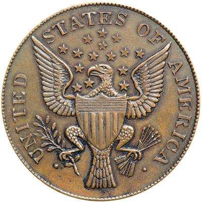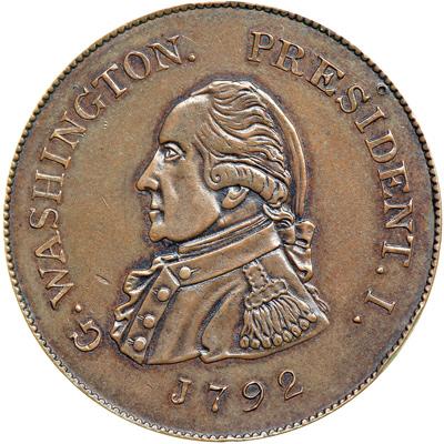 1792 Idler Copy of the Washington Half Dollar Pattern by Getz in copper Kenney-1. EF-40. Sharper but there is a tiny punchmark over the S in PRESIDENT and a couple minor rim bruises right of the date. Glossy light olive brown and chocolate. "COPY" has been carefully removed from left of the eagle's tail. These were struck by William Idler of Philadelphia circa 1860. Weight 219.1 grains.