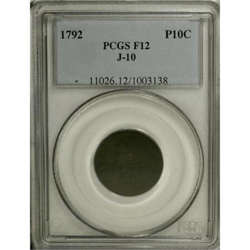 <B>1792 P10C Disme, Judd-10, Pollock-11, High R.6, Fine 12 PCGS.</B></I> The obverse portrays Liberty facing to the left with flowing locks of hair. Around, LIBERTY PARENT OF SCIENCE AND INDUS(try), the date below the bust. On the reverse, an eagle flies in a plain field with the statutory legend UNITED STATES OF AMERICA around, and the denomination DISME below. Struck in copper with a reeded edge. Although more than a dozen examples are known, four pieces are impounded in institutional holdings, including the Durham Western Heritage Museum specimen (from the Byron Reed Collection), the piece at Independence Hall (from Frank Stewart), the Eric Newman Educational Foundation coin, and the Smithsonian Institution specimen. The finest known example that is available to collectors is the former Garrett Collection coin that is now certified by NGC as Specimen-65.<BR> The example that we are offering as part of the present collection should prove more affordable, being noticeably worn, perhaps actually serving time in circulation, or as a pocket piece. All of the obverse devices, lettering, and date are visible, although the lettering along the right border is extremely faint. The reverse lettering is also visible, although weak in certain spots. The eagle is mostly gone, with parts of each wing still present. Each side has a few old scratches and minor scrapes, now blended with the surrounding surface and only of the slightest significance.<BR> Several different pattern issues were coined in 1792, along with the silver half disme that is now considered a regular issue coin. The various pattern issues of this year represent a variety of coin denominations from the cent to the quarter dollar. Each and every one of these patterns is historically important, and each is also a major rarity. Of all the different pattern varieties coined, not more than 60 pieces survive in total.<BR> There are many unanswered questions surrounding this particular pattern issue. Although Walter Breen once attributed the designs and engraving to Adam Eckfeldt, it is not known with certainty who did the actual work. It is also not known when these pieces were struck, although Andrew Pollock III suggested that they may have been produced at about the same time as the half dismes, citing "stylistic similarity between the reverses of the two denominations." The obverse design was undoubtedly influenced by Augustin Dupre's Libertas Americana Medal, and is quite similar to the 1793 half cent obverse. Population: 1 in 12, 6 finer (12/07).<BR><BR><b>Shipping:</b> Coins & Currency (<a target="_blank" href="http://www.heritageauctions.com/common/shipping.php">view shipping information</a>)