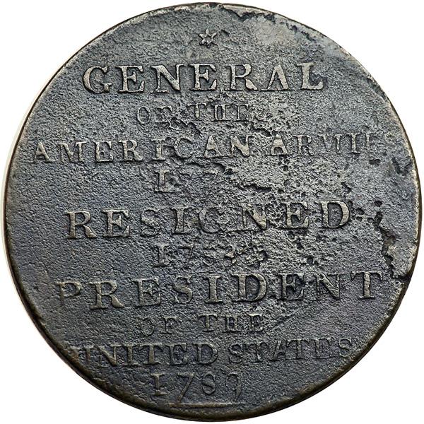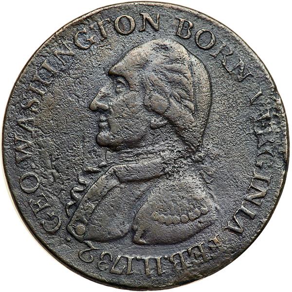 (1792) Washington Born Virginia in Copper Breen-1239 Baker-60 NGC graded VF Details, corrosion. Slightly glossy dark steel and olive brown. No marks or verdigris, but the surfaces are covered with fine to moderate roughness, strongest over VIRG. The legends are nearly complete, the only weakness on the two dates in the center of the reverse, as usual. Struck using the second reverse die. A decent albeit imperfect example of this popular Washington item.