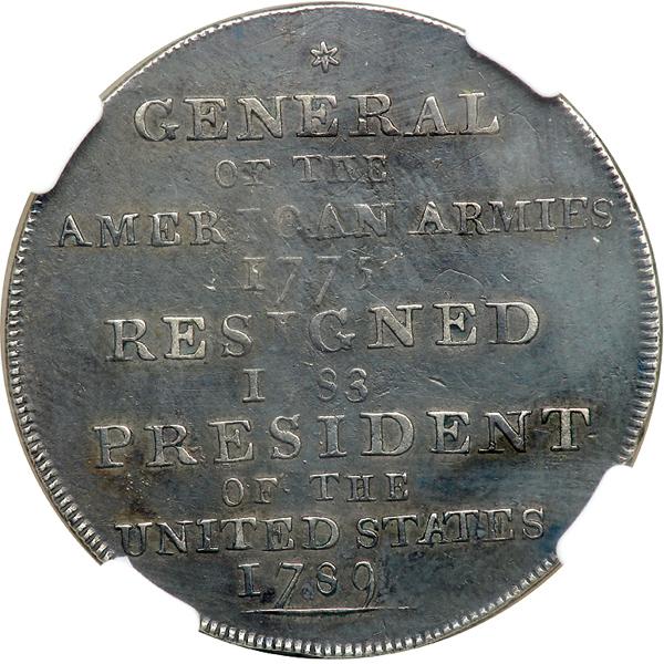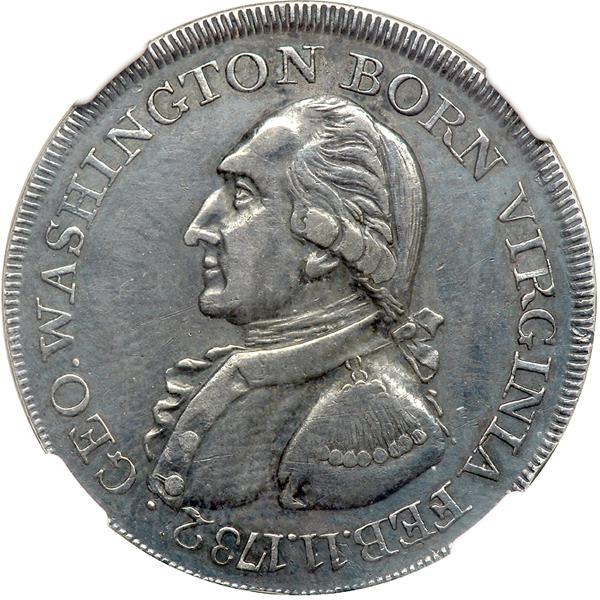 (1792) Washington Born Virginia in Silver with Plain Edge Breen-1240 Baker-60A Whitman-10740 NGC graded XF Details, improperly cleaned. Glossy dark grayish silver with lighter silvery gray toning on the highpoints. The surfaces are smooth and attractive, but a glass reveals some fine hairline scratches on both sides, strongest in the field before the portrait. None of these marks is visible without the aid of a glass and the eye appeal of this piece remains quite nice. The best identifying marks are a small nick hidden in the dentils over the G in VIRGINIA and a minor rim bruise at the bottom of the obverse (both marks clearly identifying this piece as the John Roper coin). Struck using the second reverse die, as are all the known pieces struck in silver. These were designed and struck as patterns for a copper cent and silver half dollar for our new country. About a half dozen examples are known in silver, and all but two of those were holed and plugged. The piece being offered here is one of the two "unholed" examples. Breen said it had never been holed and the Stack's catalog for the 1983 Roper sale said so as well. However, in our opinion it was holed (between the N and B above the head, just like on the "holed" examples). The hole was small and did not affect any of the design elements, and the plug repair was done with such exceptional skill that it is virtually undetectable. This leads us to suspect that the other "unholed" silver piece may be similarly repaired, but that is only a guess at this point. Regardless, the piece offered here is the finest example of this extremely rare Washington item, clearly finer than the Garrett and Robison examples (Norweb didn't have one in silver, and Ford had one with a lettered edge). A rare opportunity, indeed.
