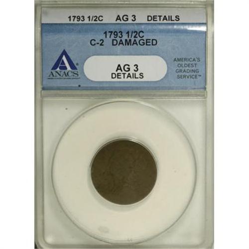 <B>1793 1/2 C --Damaged--ANACS. AG3 Details.</B></I> C-2, B-2, R.3. A well-worn survivor from this first-year half cent issue, chocolate-brown with subtly luminous, lightly pockmarked surfaces. A handful of more significant depressions are present within the wreath. EAC 3.<BR><BR><B>Coin Engraver:</B> probably Joseph Wright<BR><BR><b>Shipping:</b> Coins & Currency (<a target="_blank" href="http://www.heritageauctions.com/common/shipping.php">view shipping information</a>)