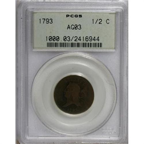 <B>1793 1/2 C AG3 PCGS.</B></I> C-1, B-1, High R.3. HALF CENT is worn smooth, but the remaining legends are discernible. The date is clear, and Liberty's eye is visible. Only mildly granular for the grade. Encased in an old green label holder. EAC 2.<BR><BR><B>Coin Engraver:</B> probably Joseph Wright<BR><BR><b>Shipping:</b> Coins & Currency (<a target="_blank" href="http://www.heritageauctions.com/common/shipping.php">view shipping information</a>)