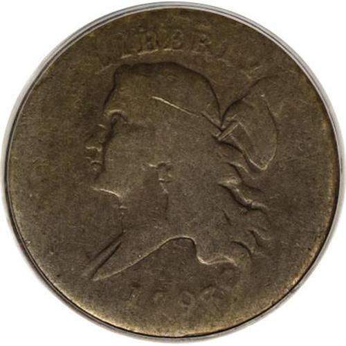<B>1793 1/2 C VG8 PCGS.</B></I> B-3, C-3, R.3. Misattributed by PCGS as "Bent Cap, Periods." The cap is normal and the bust line is hooked, with the final A joined to the right stem end. Smooth light tan and olive with hints of gold, the well worn surfaces are mostly blemish free, with an old scrape in the hair. EAC 4.<BR><BR><B>Coin Engraver:</B> probably Joseph Wright<BR><BR><b>Shipping:</b> Coins & Currency (<a target="_blank" href="http://www.heritageauctions.com/common/shipping.php">view shipping information</a>)