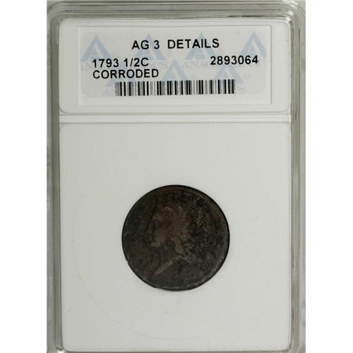<B>1793 1/2 C --Corroded--ANACS. AG3 Details.</B></I> C-1, B-1, High R.3. Believed to be the scarcest of the four die marriages for the date, as well as the <I>first</B></I> Cohen variety struck, although it is less distinctive than its AMERI. cent counterpart. The types and most legends are apparent despite extensive maroon and ebony verdigris. Perhaps lightly burnished. EAC 2.<BR><I>From The Cocoa Beach Collection.</B></I><BR><BR><b>Shipping:</b> Coin/Currency (<a target="_blank" href="http://www.heritageauctions.com/common/shipping.php">view shipping information</a>)