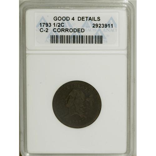 <B>1793 1/2 C --Corroded--ANACS. Good 4 Details.</B></I> C-2, B-2, R.3. Heavily worn with walnut-brown and medium-brown surfaces that have significant areas of corrosion on each side. The reverse appears to have better detail than the obverse. EAC 3.<BR><BR><b>Shipping:</b> Coin/Currency (<a target="_blank" href="http://www.heritageauctions.com/common/shipping.php">view shipping information</a>)