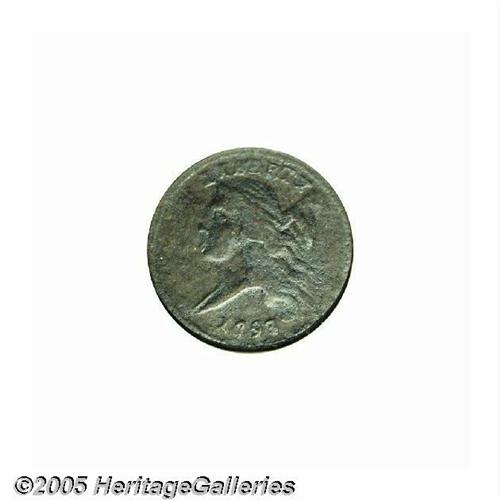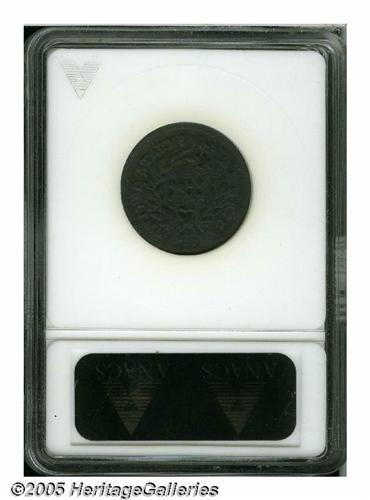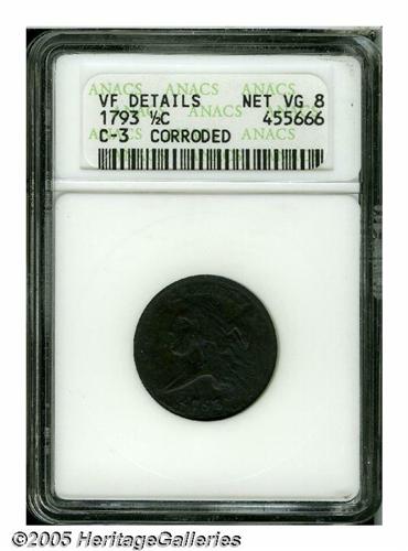 <B>1793<1/2 C>--Corroded--ANACS. VF Details, Net VG8.</B></I> B-3, C-3, R.3. A moderately porous lavender-brown piece. The legends are blurry but legible. There are no unpleasant marks. First year Half Cents are not only collectible by variety, but they constitute a separate type, since the Liberty Cap design faces left, instead of right as in subsequent years.
