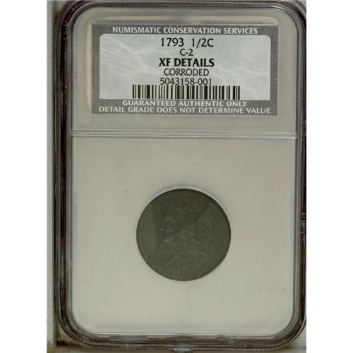 <B>1793 1/2 C --Corroded--NCS. XF Details.</B></I> C-2, B-2, R.3. Deep steel-brown surfaces with hints of dark green color on both sides. The surfaces are finely porous with a few ancient scratches, commonly seen on these early U.S. coins. Apparently struck on a overweight planchet, although the exact weight cannot be determined due to the holder. EAC 20.<BR><BR><b>Shipping:</b> Coin/Currency (<a target="_blank" href="http://www.heritageauctions.com/common/shipping.php">view shipping information</a>)