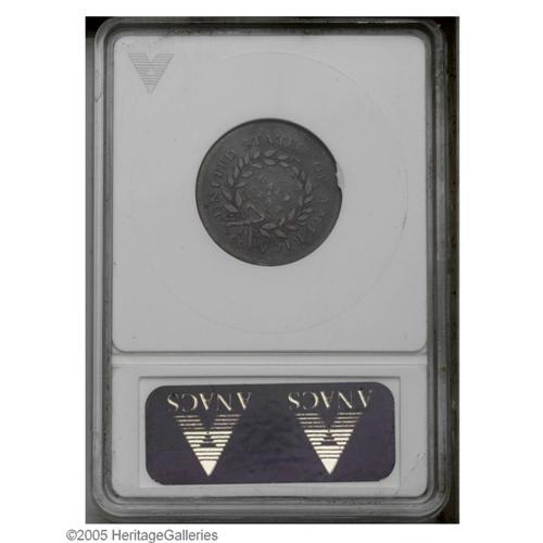 <B>1793<1/2 C>--Corroded, Plugged--ANACS. VF Details, Net VG8.</B></I> B-2, C-2, R.3. The C in AMERICA and opposite on the E in LIBERTY appear re-engraved, and provide the location of the likely plug. This bold Half Cent has grainy lavender surfaces, with some verdigris present along the left obverse border and through the final A in AMERICA. A couple of old scratches are left of the date and on the lowest hair curl. First year Half Cents are also desirable as a single year type, and all four die varieties are collectible despite their scarcity.