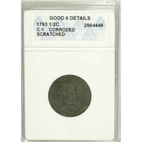 <B>1793 1/2 C --Corroded, Scratched--ANACS. Good 6 Details.</B></I> C-1, B-1, High R.3. The scarcest variety of the year, this example shows recutting on the top of 9. A couple of deep scratches are noted on each side, and the central reverse details are entirely worn away. Moderately corroded. EAC 3.<BR><BR><b>Shipping:</b> Coins & Currency (<a target="_blank" href="http://www.heritageauctions.com/common/shipping.php">view shipping information</a>)