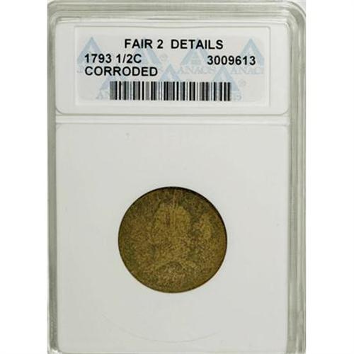 <B>1793 1/2 C --Corroded--ANACS. Fair 2 Details.</B></I> C-1, B-1, High R.3. The close 17 in the date identifies the obverse, and the location of the leaf near the first A in AMERICA ensures the attribution. Liberty is nicely outlined and the date is clear, but the reverse and LIBERTY are heavily worn. A granular piece with two thin parallel marks near 12 o'clock. EAC 1.<BR><BR><B>Coin Engraver:</B> probably Joseph Wright<BR><BR><b>Shipping:</b> Coins & Currency (<a target="_blank" href="http://www.heritageauctions.com/common/shipping.php">view shipping information</a>)