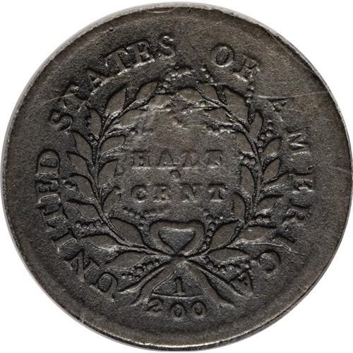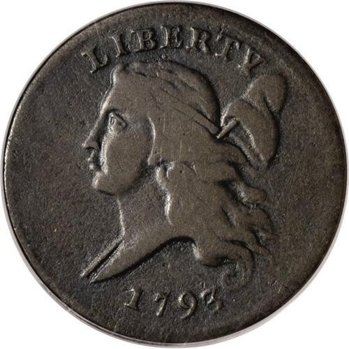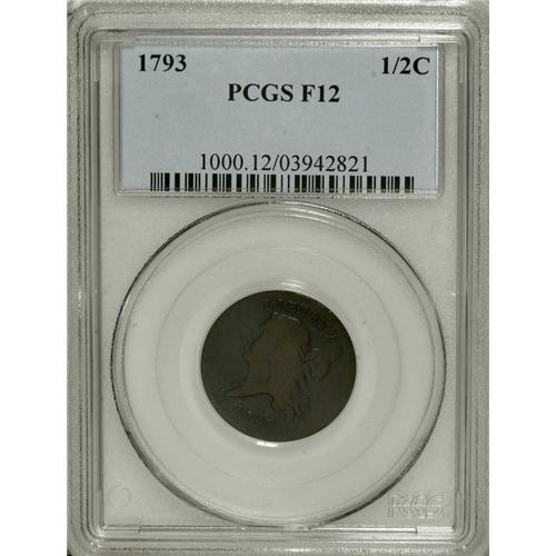 <B>1793 1/2 C Fine 12 PCGS.</B></I> C-3, B-3, R.3. This dark brown piece has surprisingly smooth surfaces, and all legends are sharp aside from HALF CENT, which is nonetheless fully legible. A thin mark beneath the I in AMERICA provides an identifier. EAC 8.<BR><I>Ex: Coin Galleries, 11/81, lot 1443.</B></I><BR><BR><b>Shipping:</b> Coins & Currency (<a target="_blank" href="http://www.heritageauctions.com/common/shipping.php">view shipping information</a>)